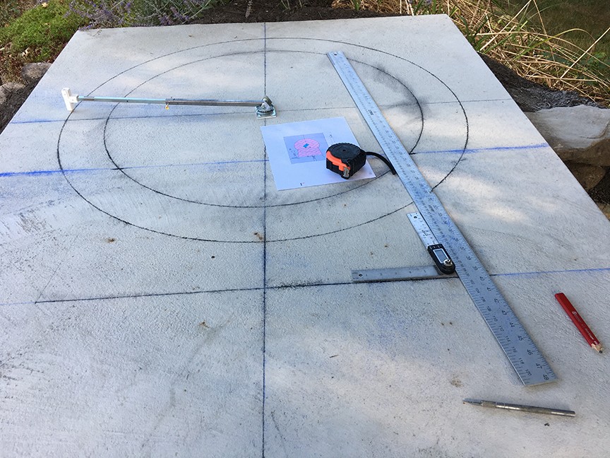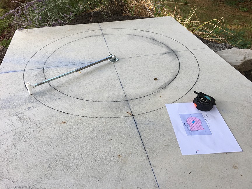 Some photos attached showing the start of my layout. I had tinkered with and revised the IT tool. I used the caster method but found there was a lot of play in the caster. So took it apart, removed the bearings and enlarged the hole where the harness mates with the base. Inserted a delrin bushing to make the tolerance a bit tighter and reassembled. That helped. Also lowered the hole where the arm mounts in the harness so it's more aligned with the center axis of rotation (not perfect, but closer to the center axis). I drilled a hole through the concrete hearth where the center line axis winds up and mounted a temporary dowel pin to the bottom of the IT plate to pencil in the layout using the IT. That concrete center hole can also serve as a weep hole.