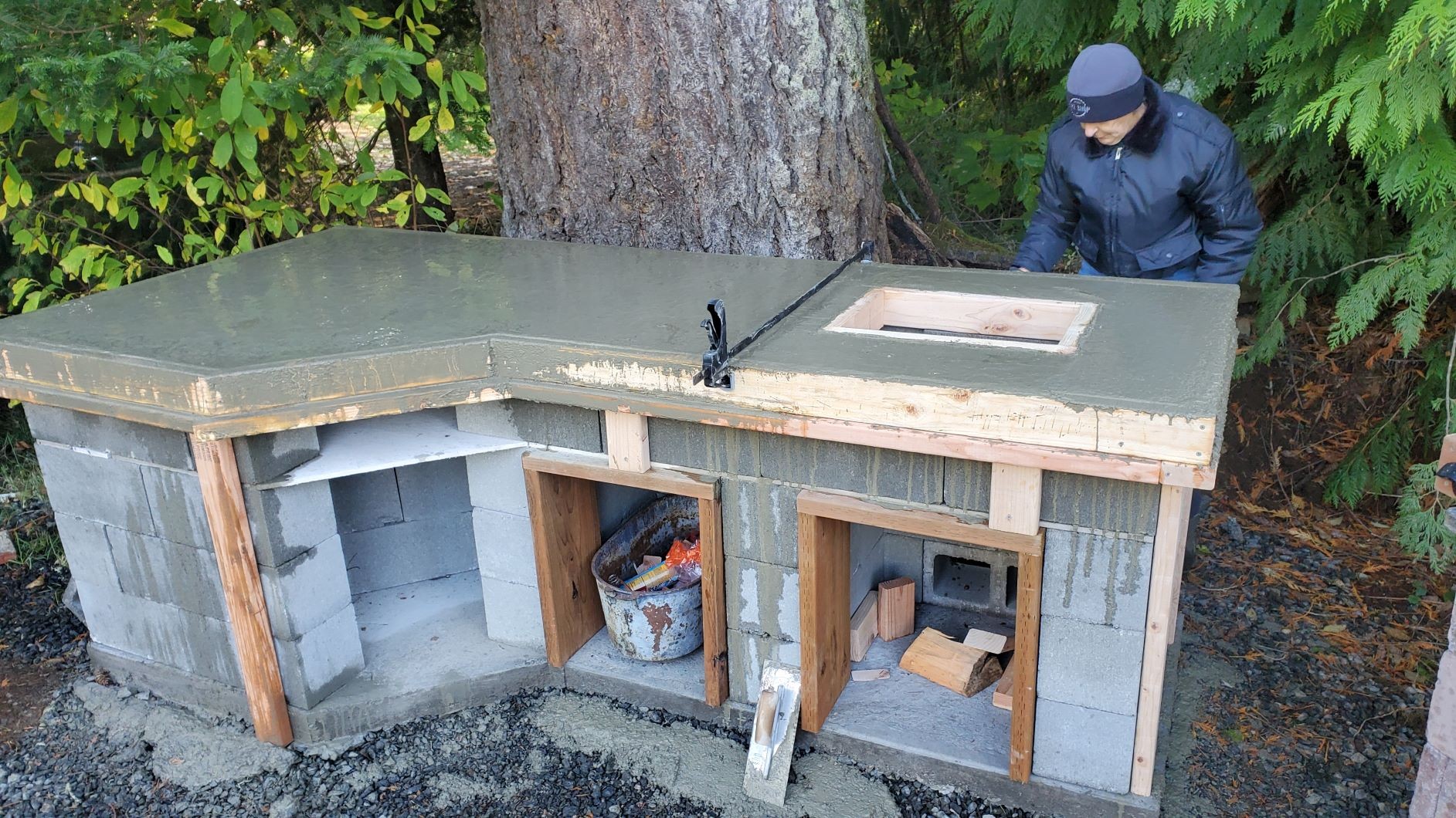 So with all this in mind, I'm trying to not sell myself short on the pizza oven as I'm sure I'll want to utilize it for breads, roasts, and what-not as many others do. If I recall, aren't you incorporating a smoker into your build as well? My fire box sits down at the end of the BBQ island and the smoke chamber is incorporated inside the island. I have learned this design is a bit flawed, as whenever I lift the lid to get to the smoke chamber you get a face full of smoke..