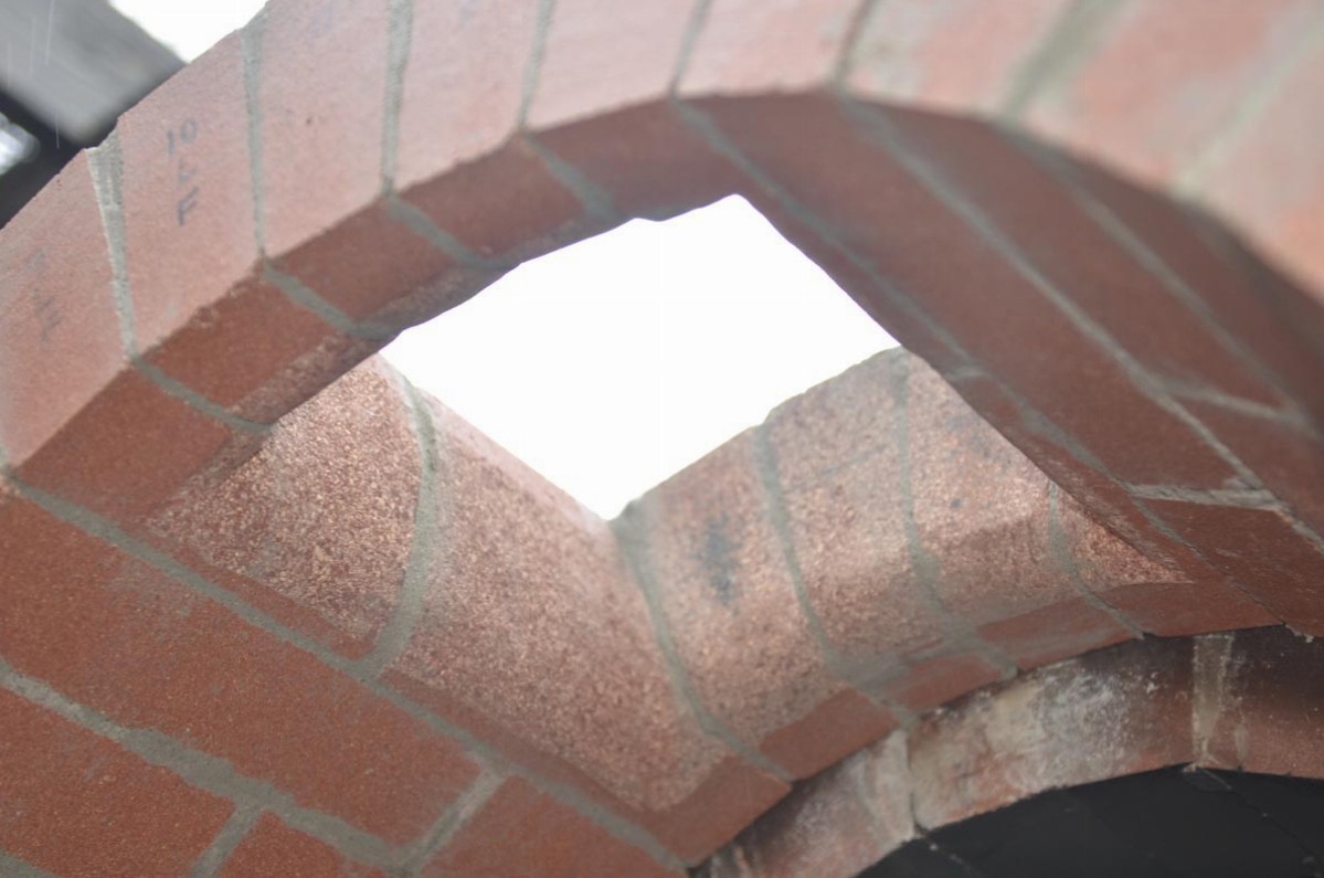 With the sides of the landing arch being flared outwards a bit, and with the top of the arch being not flared, but flat/level? The length of the brick course will decrease slightly as you move towards top-dead-center of the landing arch, going from 'flared' to 'non-flared'. Not by much, just a fraction of an inch. No math calculations or measurements will be required though. Just keep the face of the landing arch bricks even with the face of your arch form. As long as the form itself is plumb/vertical, the face of your landing tunnel arch will be plumb/vertical. The top will be quite easy as the chimney vent hole will be there.