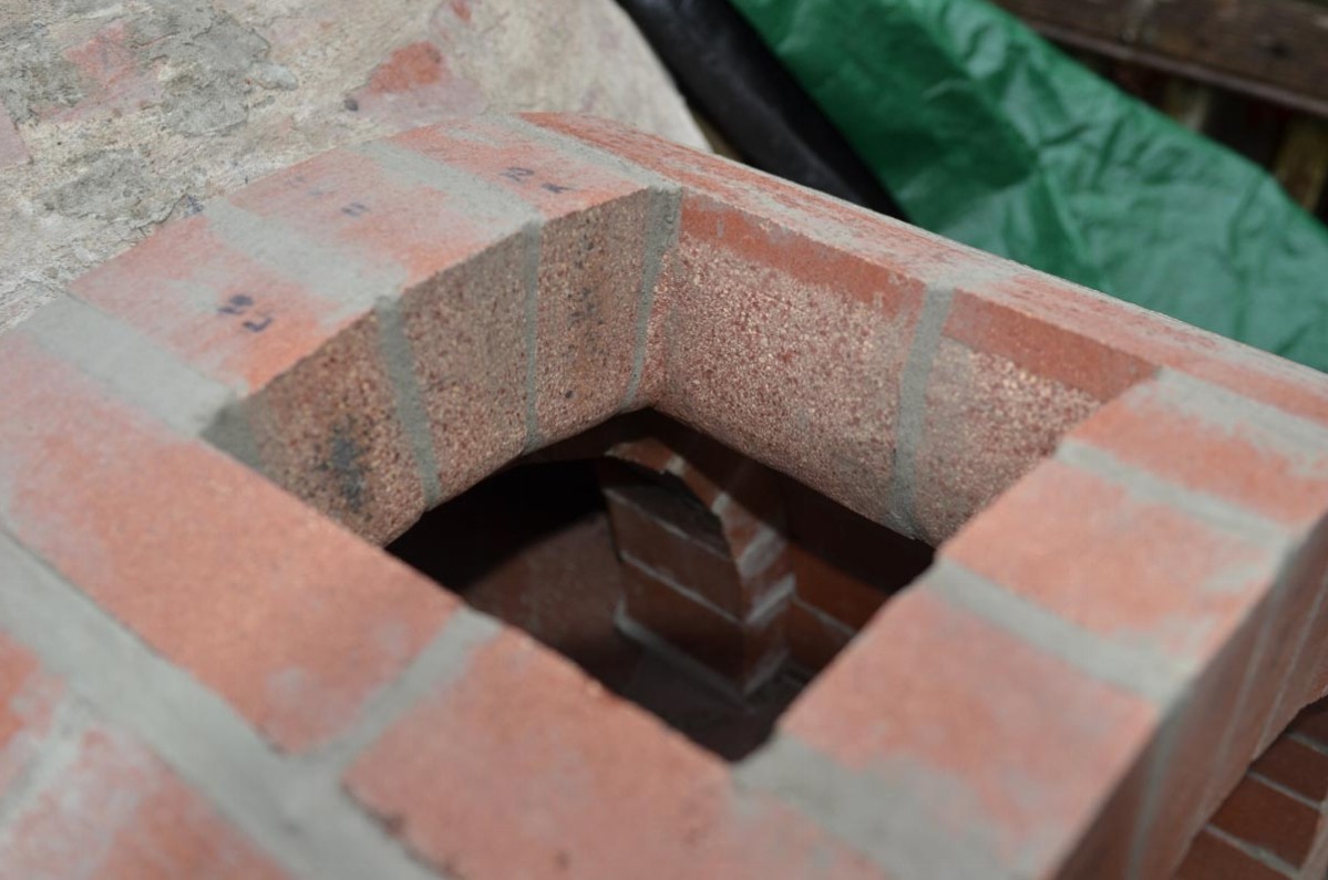 My landing tunnel itself it an 8" square opening on top of the arch bricks, so 13-1/2" less 8" divided by 2 left me with 2-3/4" of arch brick in front of and behind the chimney opening. Structurally that seemed fine. The bottom of that opening flares out to 10" square. I did the flare in hopes of getting a less turbulent flow as exhaust came out of the oven and was drawn up the flue. The flare was very easy to do with an angle grinder. With a 13-1/2" deep landing and a 10" opening on the underside of the landing arch, 3-1/2" divided by 2, or about 1-3/4" of 'flat' arch brick in front of as well as behind that 10" flared opening.