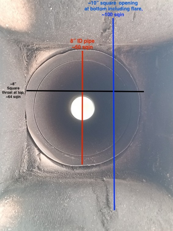 When the exhaust comes out of the oven and into the landing, it sees a 10" square (100 sqin) opening that flares to an 8" (64sqin) square opening. That then transitions to the 8" (50sqin) round opening at the anchor plate. It flows well, I have no smoke stains on my front arch after several years of fires.