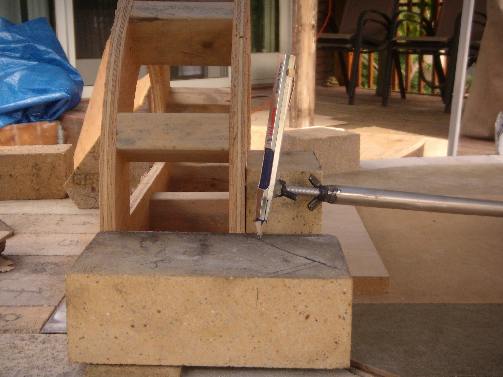 Same IT, just replaced the "L" bracket with the pencil. The carpenter pencil holder is a plastic holder from the Orange Box store, I epoxied a nut the same thread as the all thread on my IT. And you can rotate it to scribe the arch bricks as you move. My IT, not knowing any better when I did my oven, had a pivot point off the floor elevation (thickness of a piece of 3/4" ply). Current school of thought is to have the pivot point at floor elevation. I would go the Gulf route and make a wood brick to fasten the IT to then when done remove the wood brick and install the firebrick.