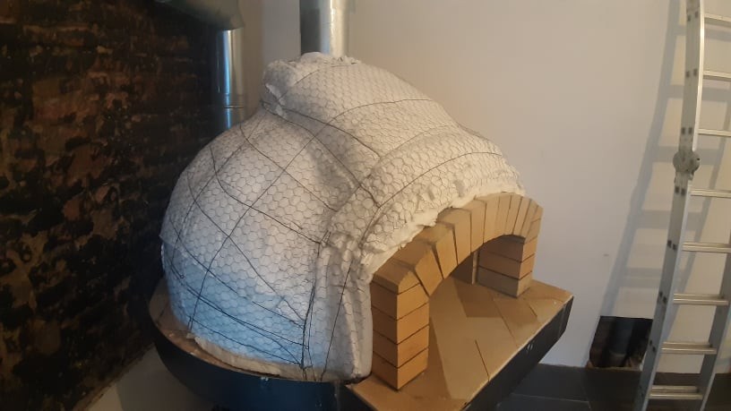 One thing: Over my furnace insulation I added conventional fibreglass insulation, a thick layer. And, over that foil. (No-one here uses foil under the plaster, apparently it slows the drying time of the wet oven construction.) The advantage of lots of insulation is that my oven holds it's heat very well and the outside plaster render remains cold. I have one small area that feels slightly warm, so I suspect I must have a tiny gap there in the insulation, but the rest of it stays cold outside even though it can be 600degC + inside.