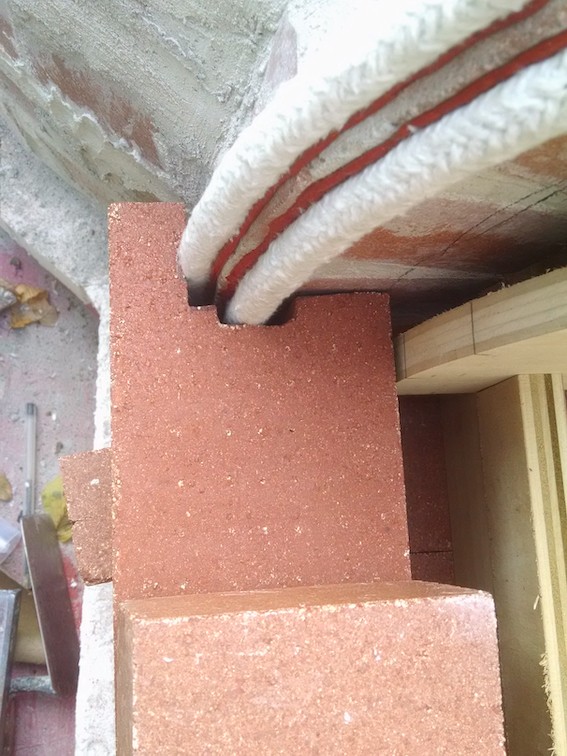 Be careful with, what they now call "L shaped brick". If you cut too much meat out of a brick it will be very brittle and prone to breakage. Either before or after they are in service. This is my early addition to heat breaks. Not the final placement. It was placed a little tighter before the actual placement but the bricks were cut the same as the pic. The wider reveal was chosen to accommodate the wider opening that the "flared" entries offered at the time without the intimidations