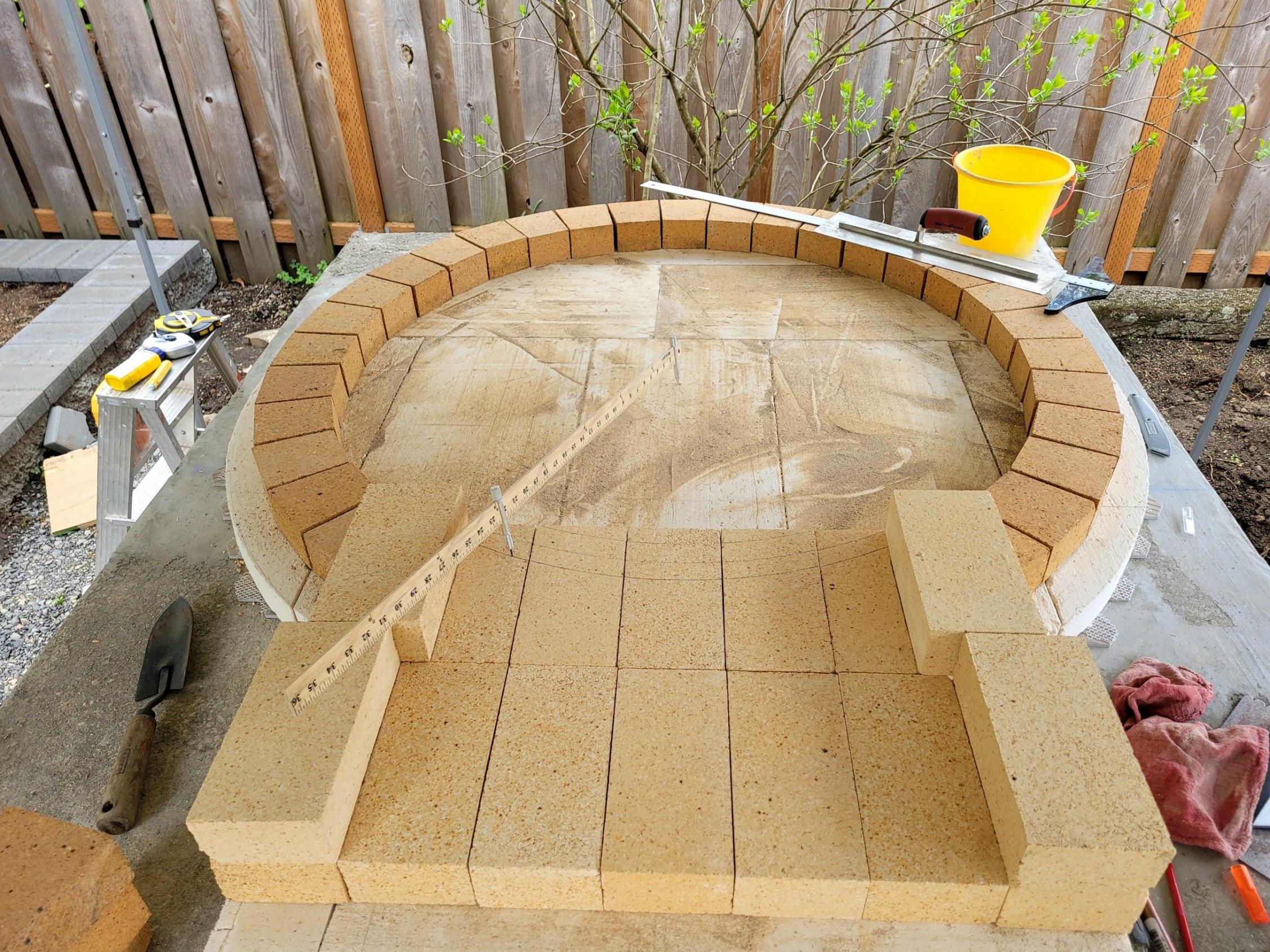 I am also considering whether to stick with the current arch height, which is a little under the ideal ratio, add another row if bricks on the bottom, which would be a little over the ideal ratio, or possibly pay a layer of cut bricks to raise the opening arch to the ideal hight. As it stands, I am a bit concerned that having the arch too low will make it harder to work the oven in the future.