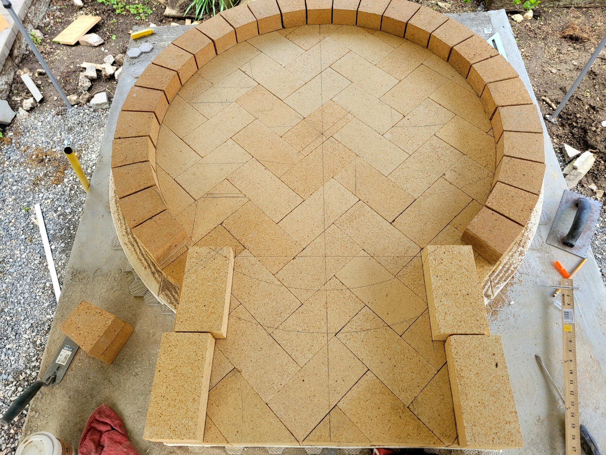 Next, while I am an no expert and hopefully somebody will weigh in here pretty soon.To me it looks like your entry bricks to the oven are to far back not allowing for the next brick to extend a little further in to the oven as you go up. I set the inner corner toward the front to the pencil line you have drawn for the outer diameter and trimmed the brick extending into the oven to match the inner diameter of the oven. As you go up there will be less to trim.