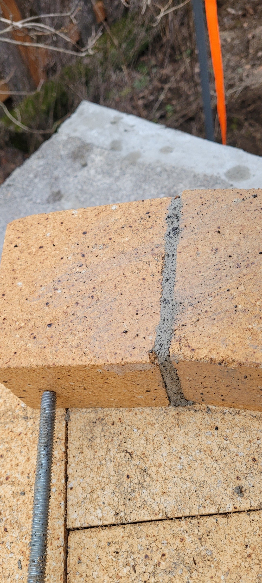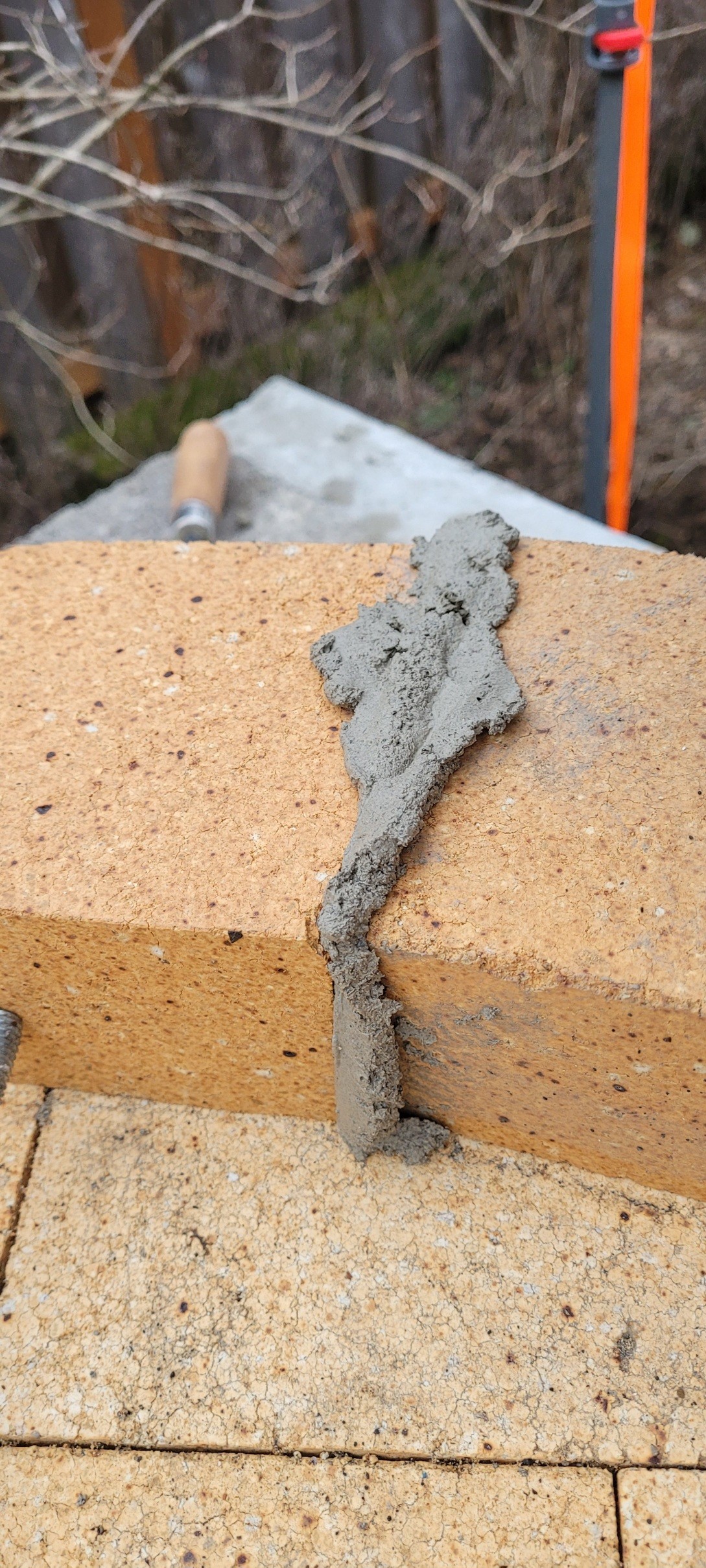 Started by inspecting the grout following our winter storm a few hairline cracks observed in the mortar, but mostly it looks good except for my final brick in the first course where mortar got under the brick. There I can see daylight through the crack, but I do not think the gap is wide enough to fill unless someone has a tip. I don't think I could get a trowel blade in the gap, so I suppose I can just live with it, unless some wise builder tells me it cannot be ignored. If I do anything, now is the time since I haven't started course 2.