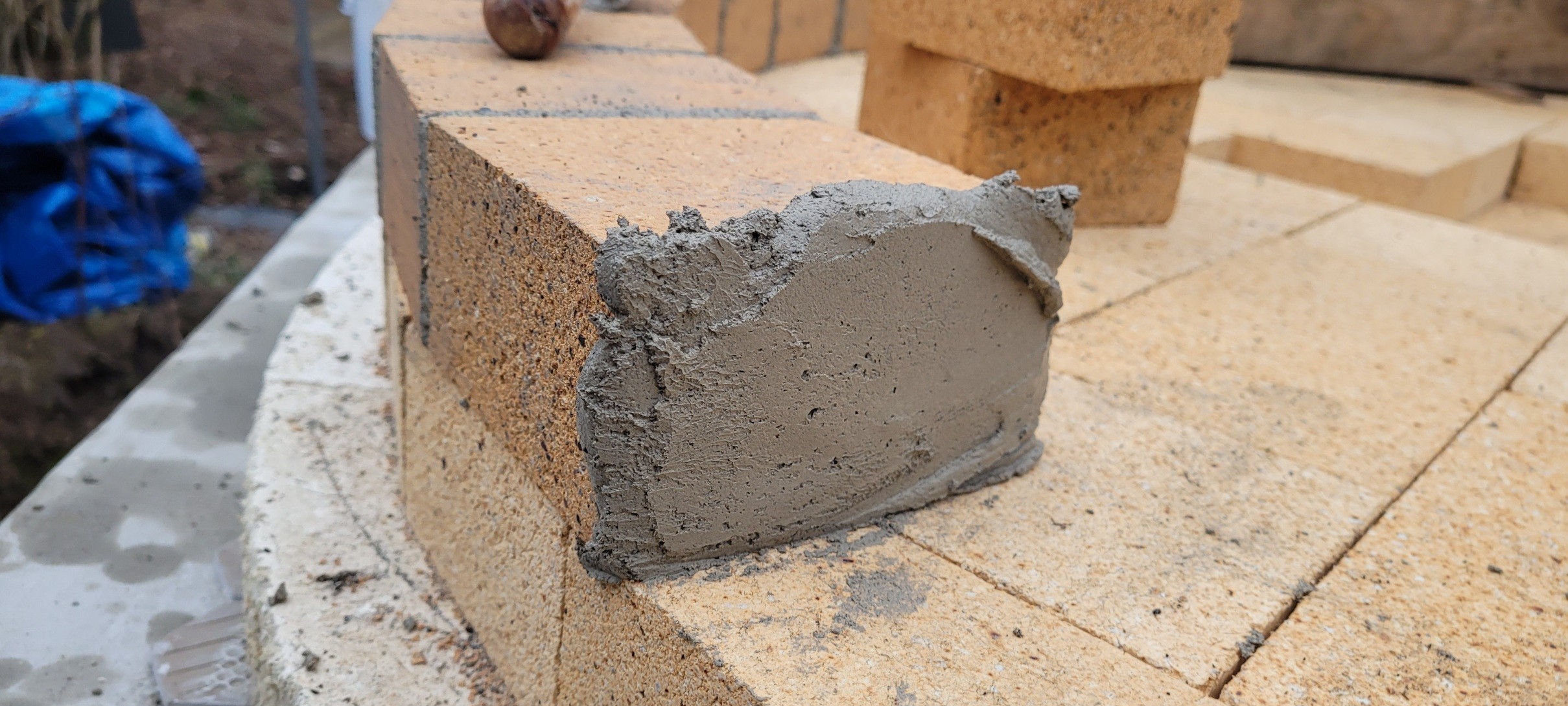 I was a little intimidated with the mortar work to start, but things went pretty smoothly. I think setting the first 2 - 3 bricks in the course is the most challenging bit as they all want to move a little. But after I had 3 bricks down the course was pretty stable. From that point I just started alternating between each end - place a brick, tap it in place, and the let it stabilize while I worked on the other side.