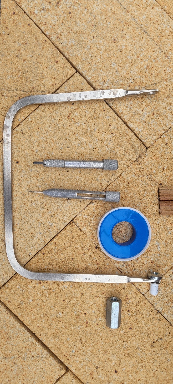 Pick 1 is parts. Note I have a 1/4" machine screw that I put through the coping saw frame and the wrapped with plumber's tape to increase diameter to > 3/8".