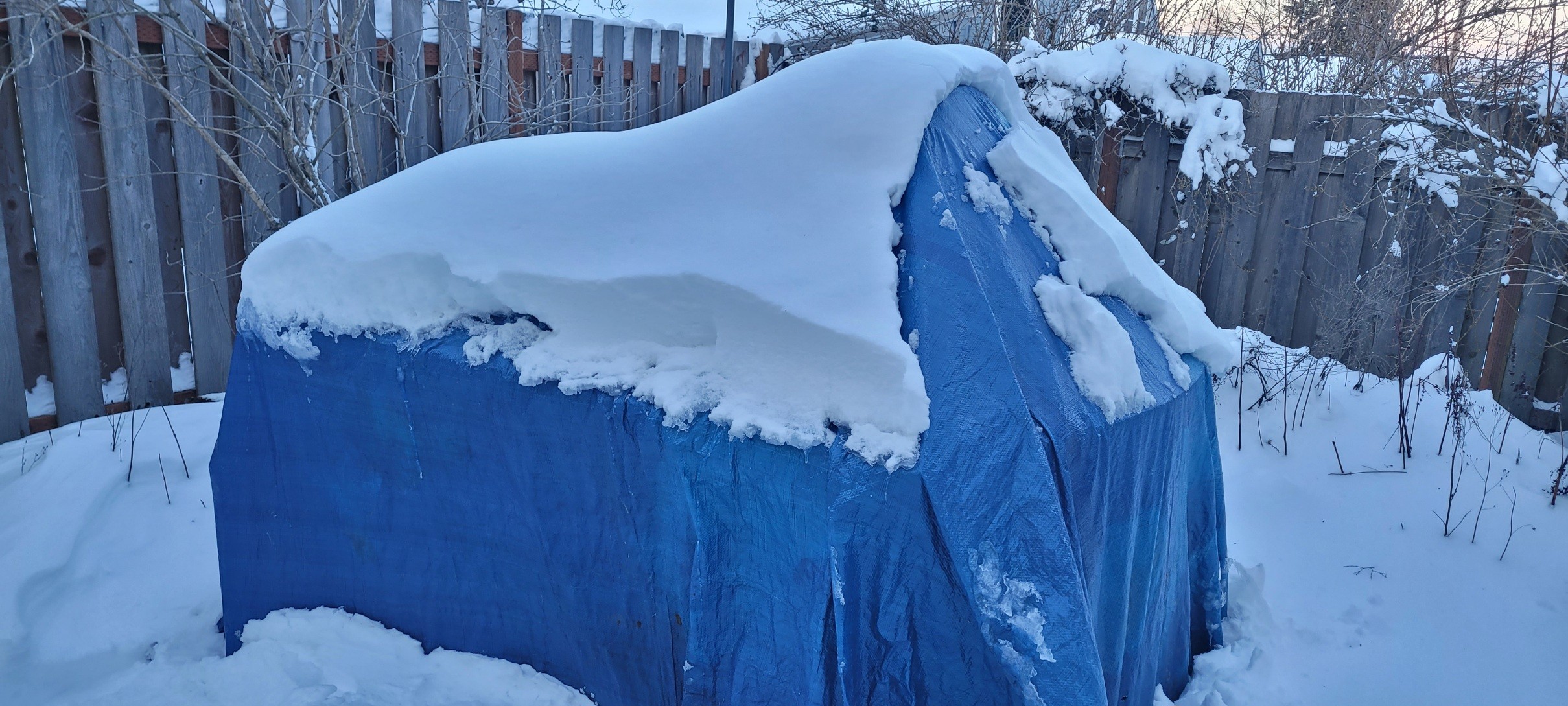 • Well, I decided based on the duration and eposidic severity of this storm to put the space heater in. The dome is covered with four layers of tarp secured with straps and the space heater is under the hearth, which ia also fully enclosed by the outermost tarp.