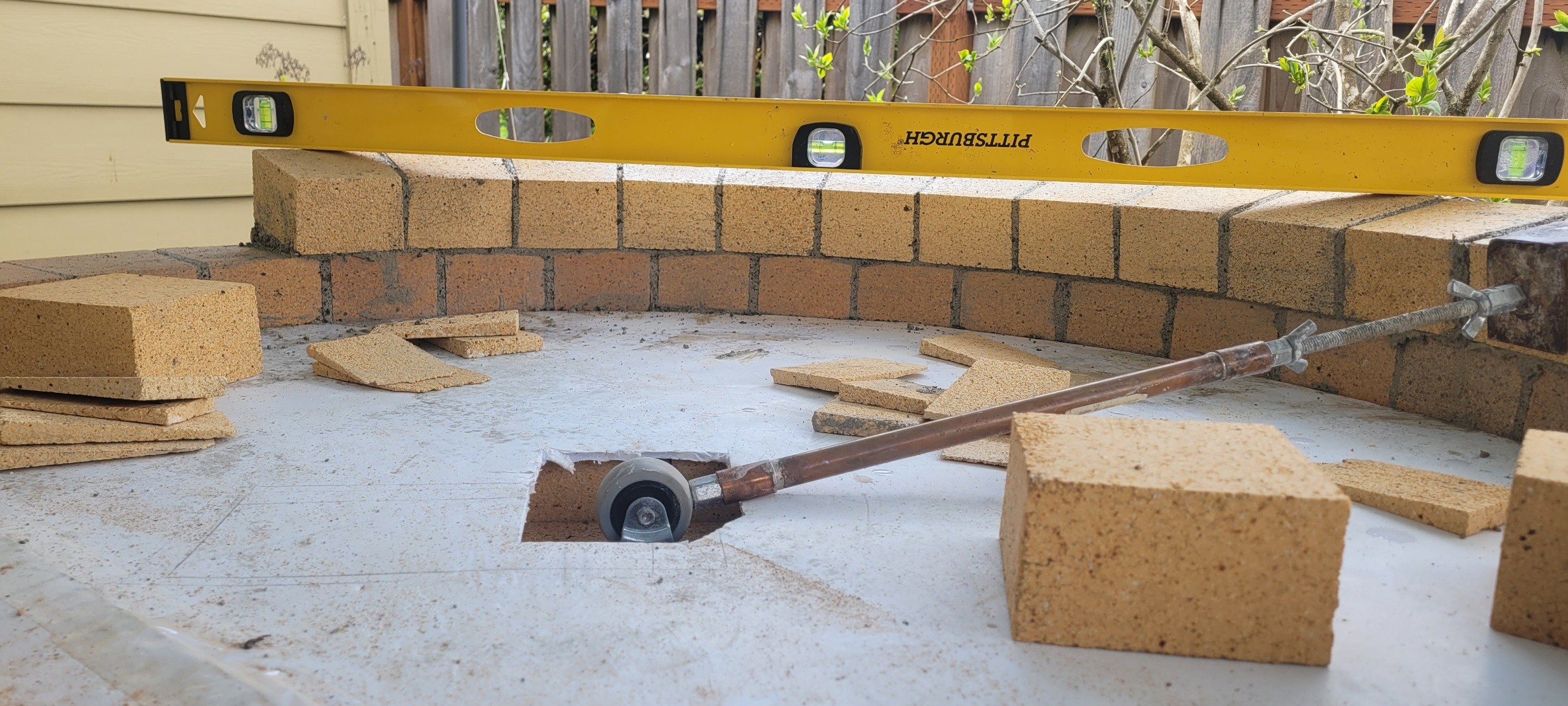 • And, back again! Folks, that was a long, wet, cold winter! But Spring is here, the flowers are blooming, trees are budding and the oven is building! Today while getting setup I had a eurika moment with the final brick in my first course that was sticking up. I got the angle grinder out and ground the brick down until it was flush with the rest of the bricks. Problem solved!
