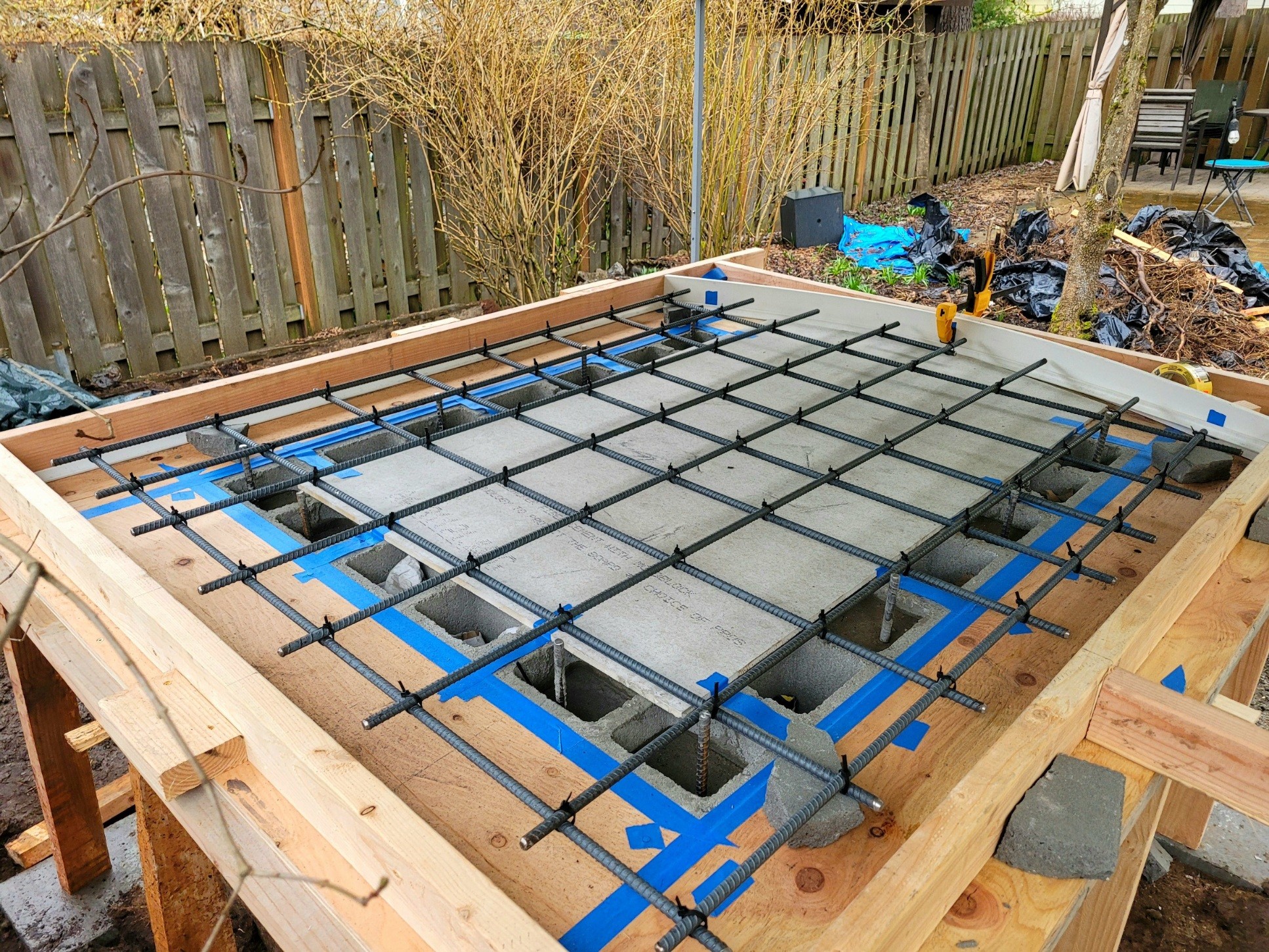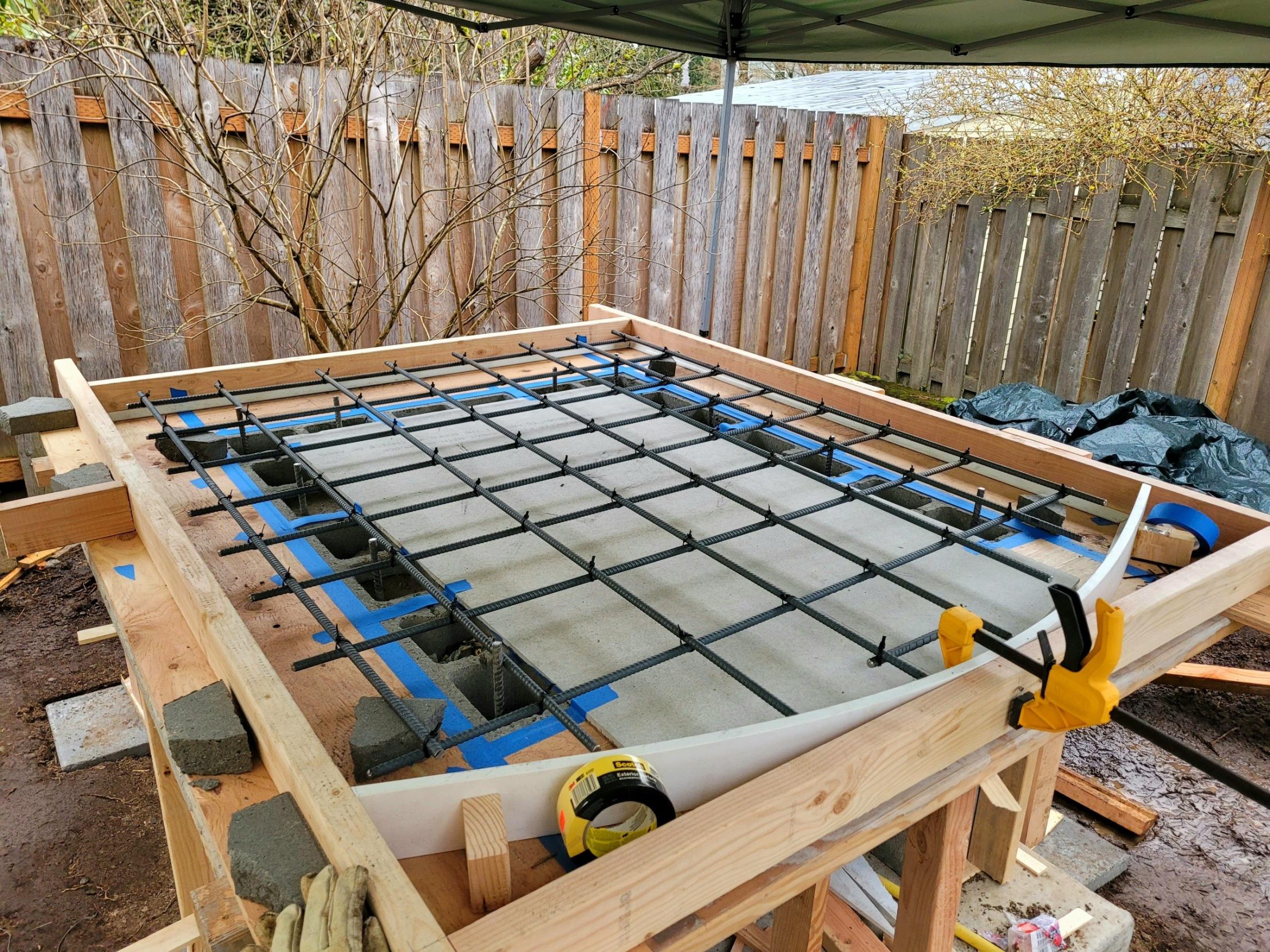 Almost there! Today I made quite a bit of progress on the form with most trim pieces cut to size, the rebar laid out and zip-tied. The weather is still not great, several days of freezing and thawing plus rain today is causing a lot of ground movement, which in turn resulted in most of my form legs getting loose and collapsing.