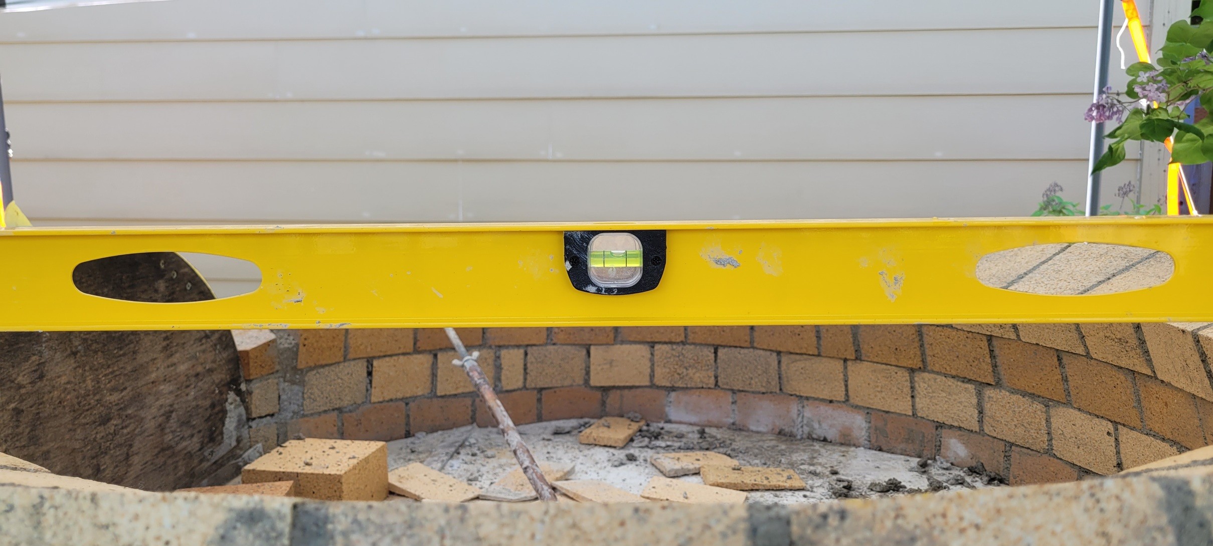 It looks pretty good, but I worry a bit about the adhesion of mortar to bricks, particularly with the circle warping a bit as I worked my way around. The one known issue is the last brick, which I slipped in from the top. On the way down it scraped some mortar off the sides of adjacent bricks and got a little bit of mortar on the bottom. I was able to sqeeze most of it out, but I figure I'll have to true up the elevation on the next course. Pictures below.