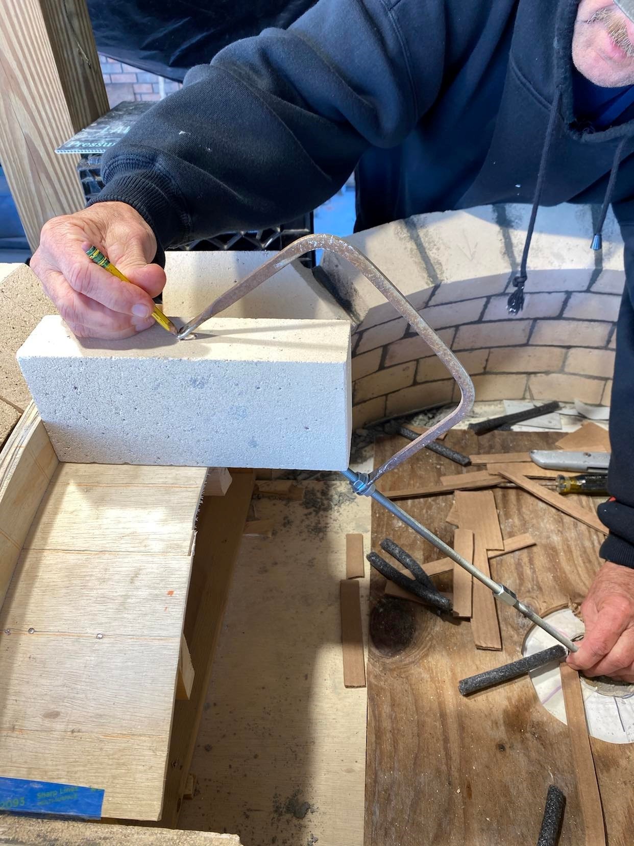 The issue was with the cut from IR to ER on the inside, top of the arch bricks. Due to the prior error, most bricks were undercut, but there were a few that were nominally overcut at the peak of the opening arch. I re-checked all the measures today, using the technique of attacing the coping saw to my IT to mark the exterior arch.