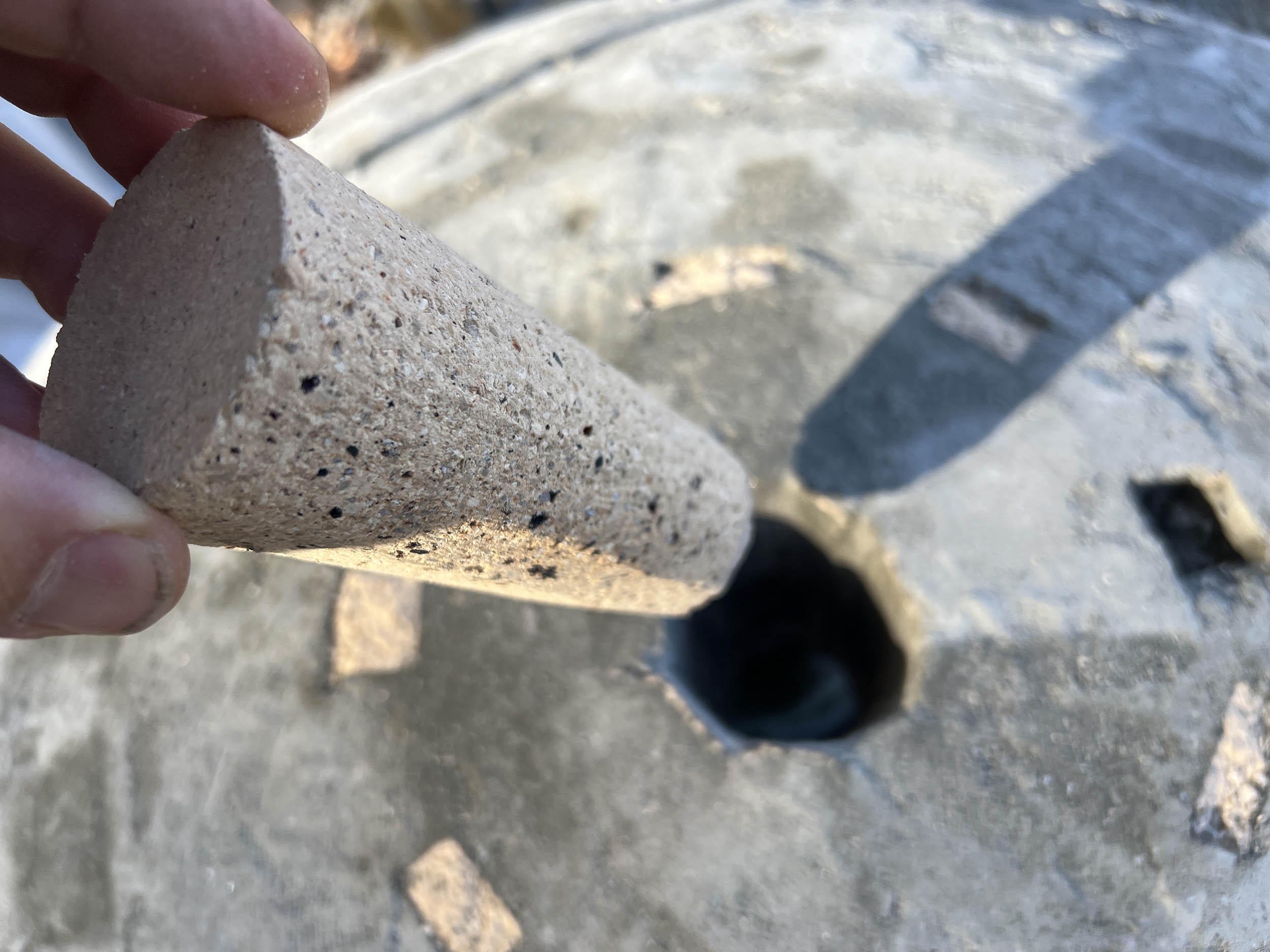 Wha-hoo... just put the plug in my dome. I went smaller and smaller with the top course block because I didn't like the larger mortar gaps due to the straddling of joints with larger blocks. As a result, the plug was a round, tapered plug. It was a long, hard journey and I had to stop and rebuild the top part of my jig as it started delaminating because of the water from the wet saw.