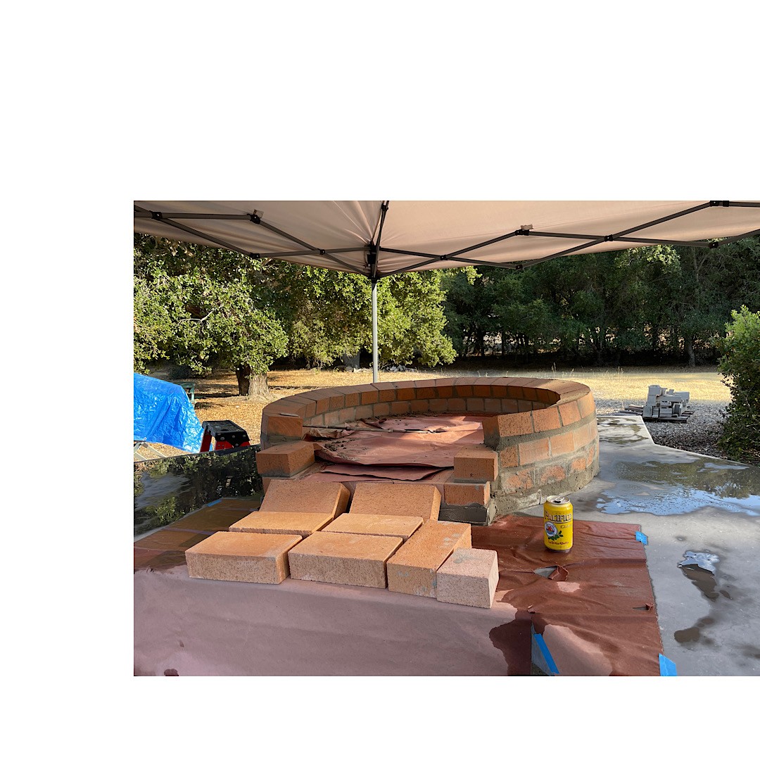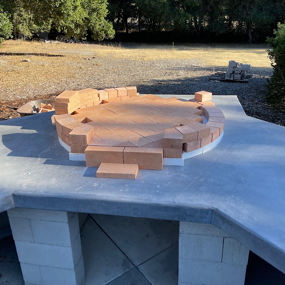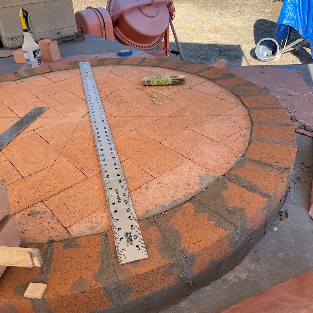 At this stage I do have two questions if anyone has the time. First I have my floor bricks in direct contact to the foam insulation. I was going to pull them up and put down a layer of clay or sand but the bed is very level. Do I really need to do that? Second does anyone have a formula for calculating the compound angle for the side cut of the bricks. I can see as the courses get higher the verticale grout joint will start to become triangular instead of parallel.