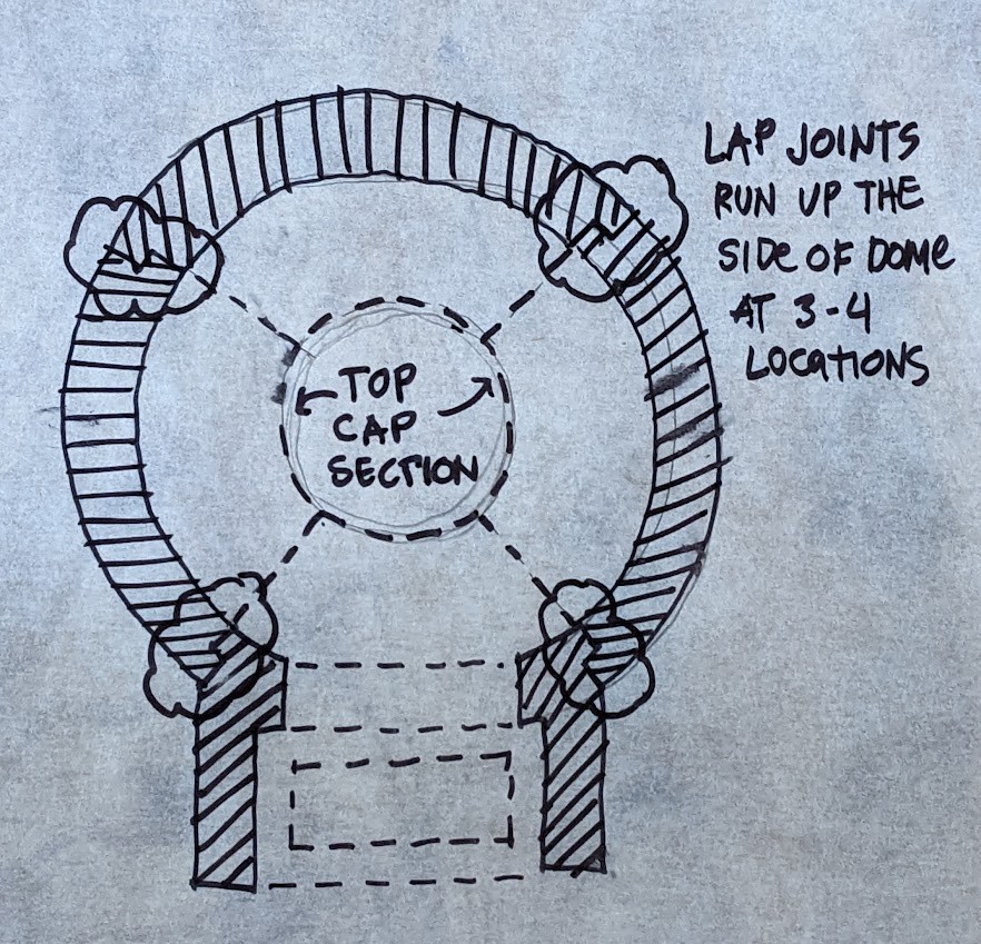 What I now realize is that there is NO REASON why we can't adapt and improve these same building techniques to the DIY Pompeii oven construction made from Firebrick. The illustration below shows how I would do it now if I were starting over... The arch is an inherently weak section, so I would frame it with joints on both sides. I'd also avoid a joint straight at the back, for aesthetic reasons, so I have two more joints at the 10:00 and 2:00 hour positions. I think it's important to have a solid top, so I would recommend at least an 18" diameter top section, which in my dome would have been the top 3 courses.
