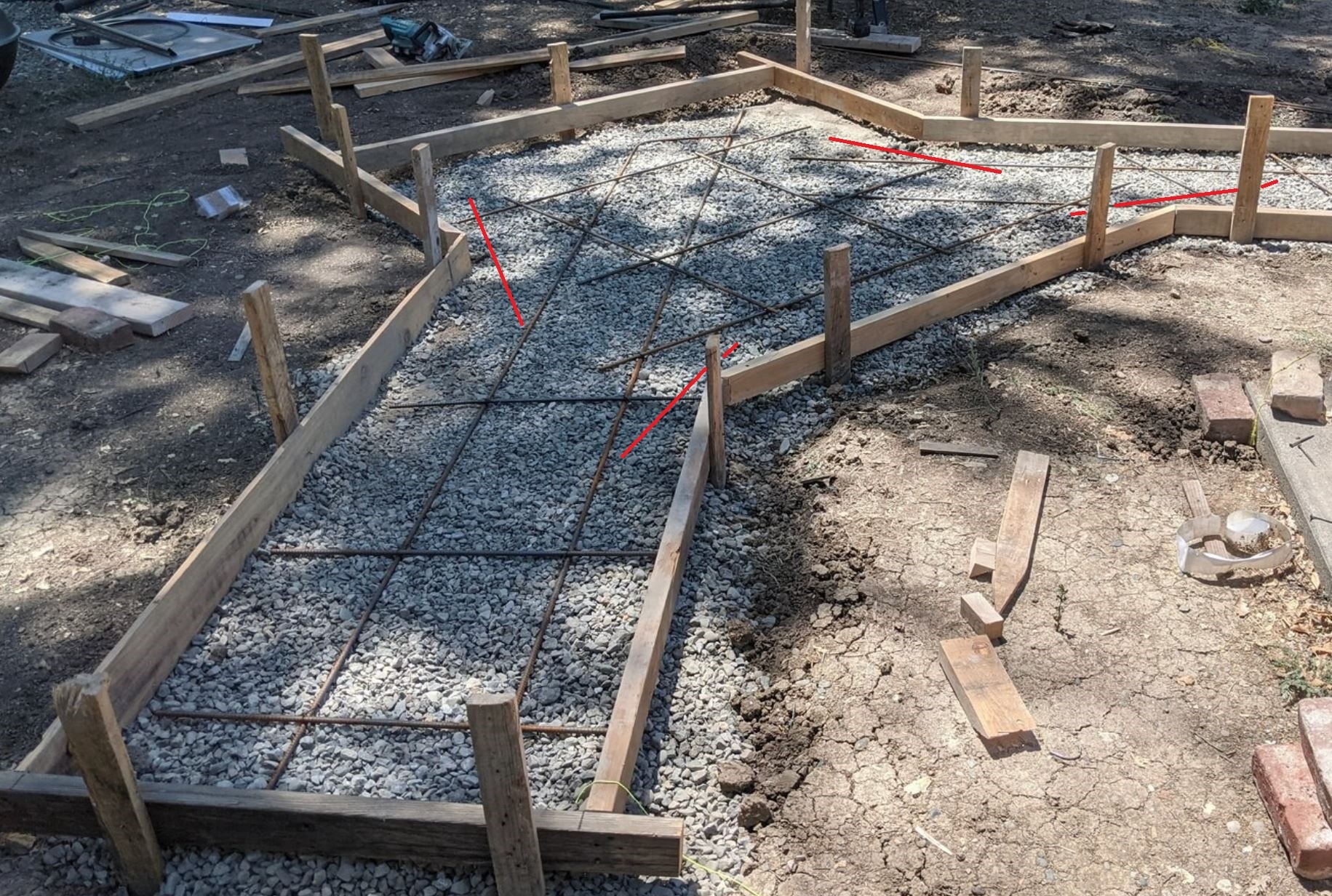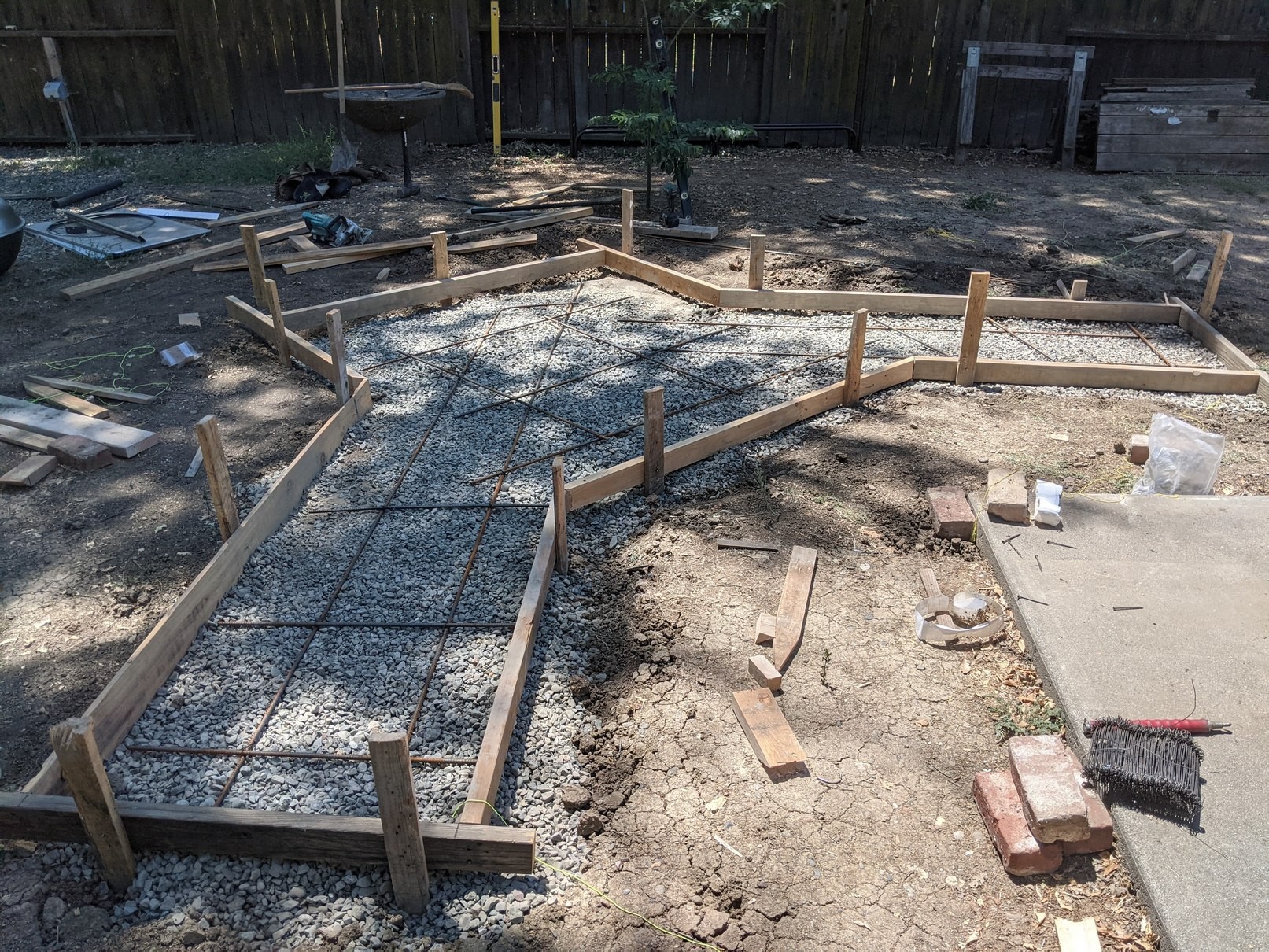 Most of our free time has been dedicated to unpacking (house is most of the way there; my woodshop in the garage is still taking shape), but some progress on the oven today! Had a reasonably good experience with the contractor we used to do some renovations before we moved in, so decided to hire one of his crews to do the foundation for me, rather than stumbling through it myself. Ultimately a good use of funds, though it ended up consuming more of my time and attention than expected, since the concrete guy was convinced the measurements I gave didn't add up, and so initially framed the central part for the oven 10 inches too narrow. After arguing round and round for half an hour, eventually convinced him to re-do the framing anyway :-P. Sure enough, the measurements worked. The rest is up to me; we're leaving on vacation for a couple weeks (plenty of time for the slab to cure), but after we get back it'll be time to get a bunch of concrete blocks and start building this thing!