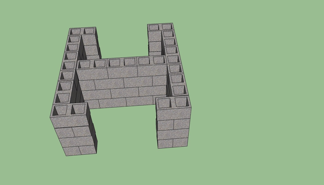 And a question for the forum as I contemplate next steps: I'm planning on doing an H-shape for my stand, as pictured in the attachment. On my previous oven I never could use the whole space underneath. I plan on casting lintels front and back, with rebar running through the block cores on either side. The question: assuming I cast the lintels first, and use cement board for the tray rather than plywood, could I get away with not building a tray support? The cement board would be spanning 24 inches the short way and 48 inches the long way. My sense if that if I built a tray support for a standard "C" shape, the plywood or cement board would have roughly the same unsupported span (supported in the middle by the tray supports, rather than by concrete blocks like I'm thinking).