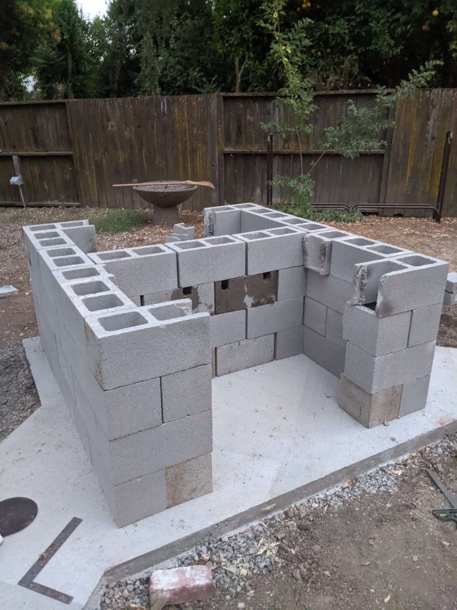 One innovation (or folly, we'll see) that I'm trying and which you can just about see in the pictures, is I put three notches in the second-to-last course of blocks to accept PVC pipes, intended as tool-holders. In my old oven I had PVC tool holders on a wooden rack in the storage area, but that wouldn't work here because of the H shape. Hoping I can have the tools above the firewood and also have the secondary storage area on the back of the oven. Or it won't actually work and I'll pull them out and do something else for tool storage--we'll see!