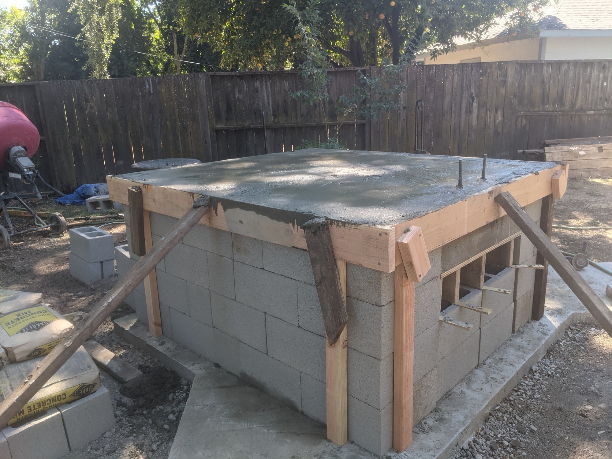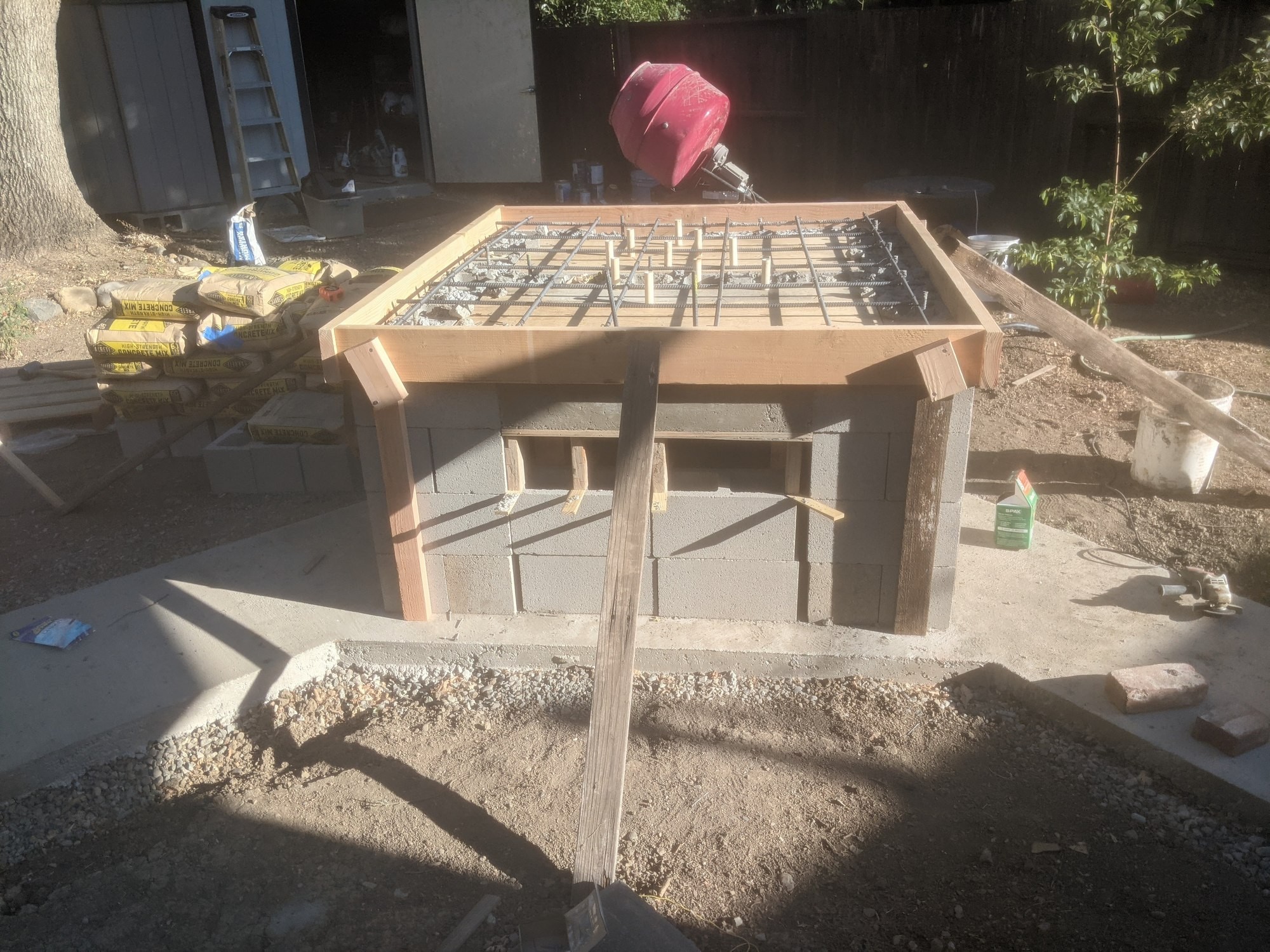 Making progress on the stand. Working East Coast 9-5 hours means I get to knock off at 2pm local, so my afternoons have been free. Only problem is it's been stupid-hot here in northern California. Got the block stand together, built forms for the lintels, and this after noon I poured the lintels and filled alternate block cores with help from my elder daughter (and from a cement mixer borrowed from my father-in-law). Those who followed my last build may remember I had a picture of her (then not quite 2) "helping" me with the gravel base under the foundation. This time she's 12-going-on-13 and was actually a huge help.