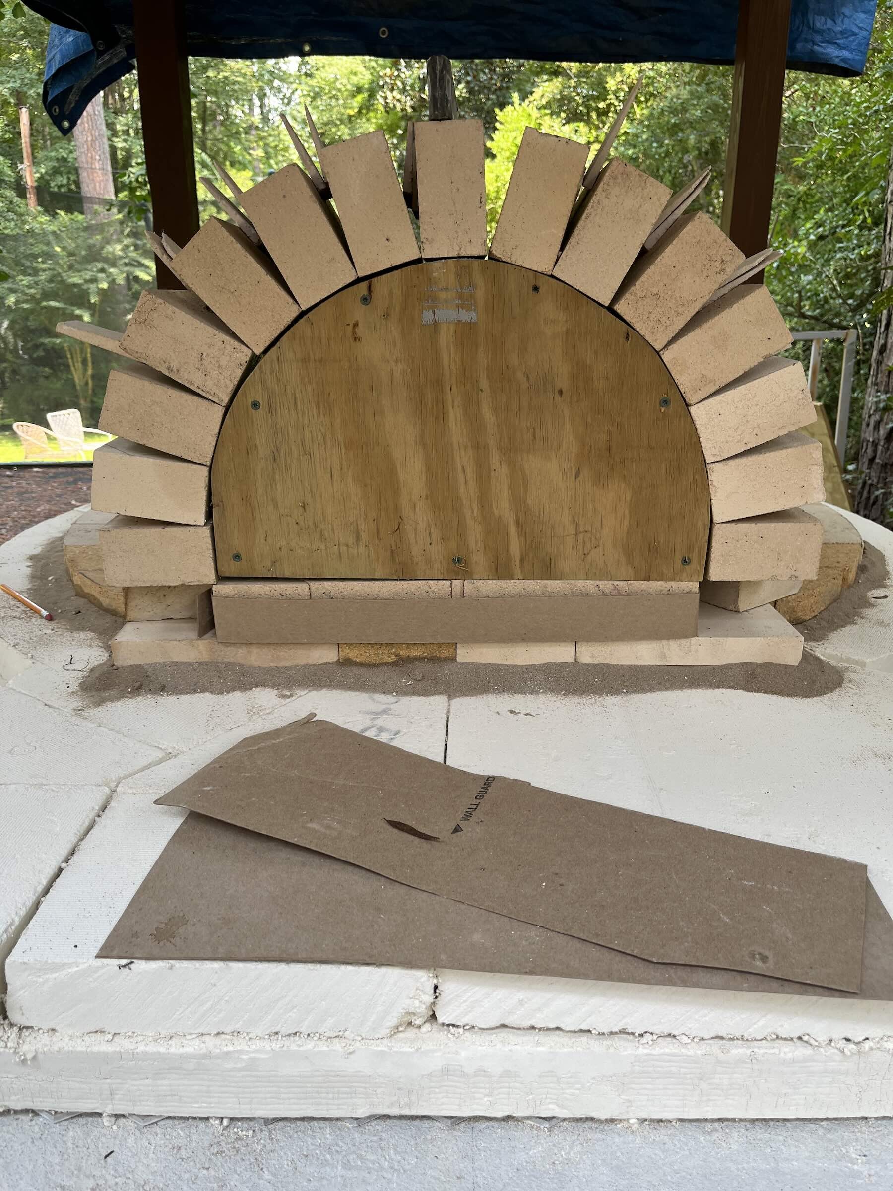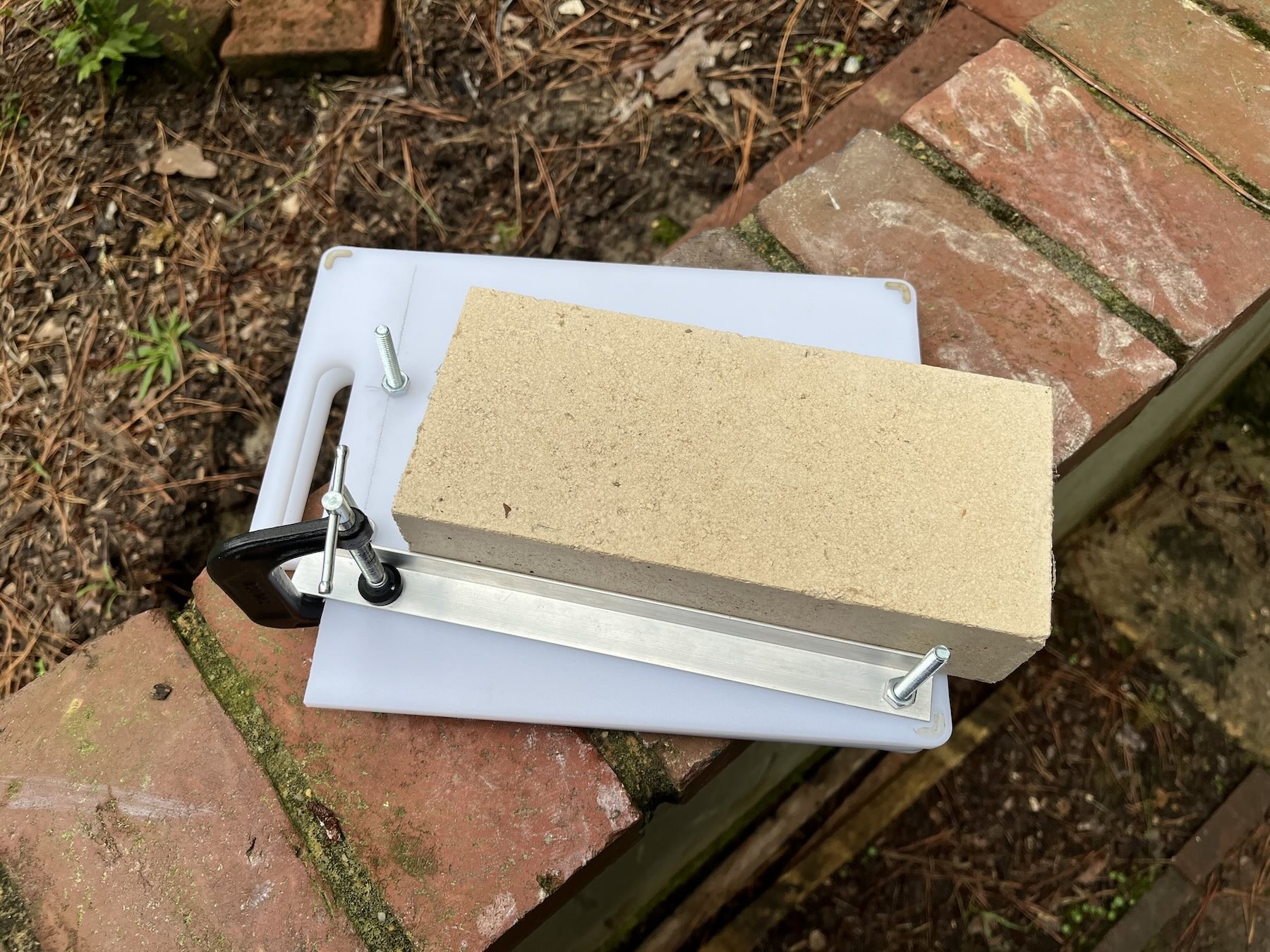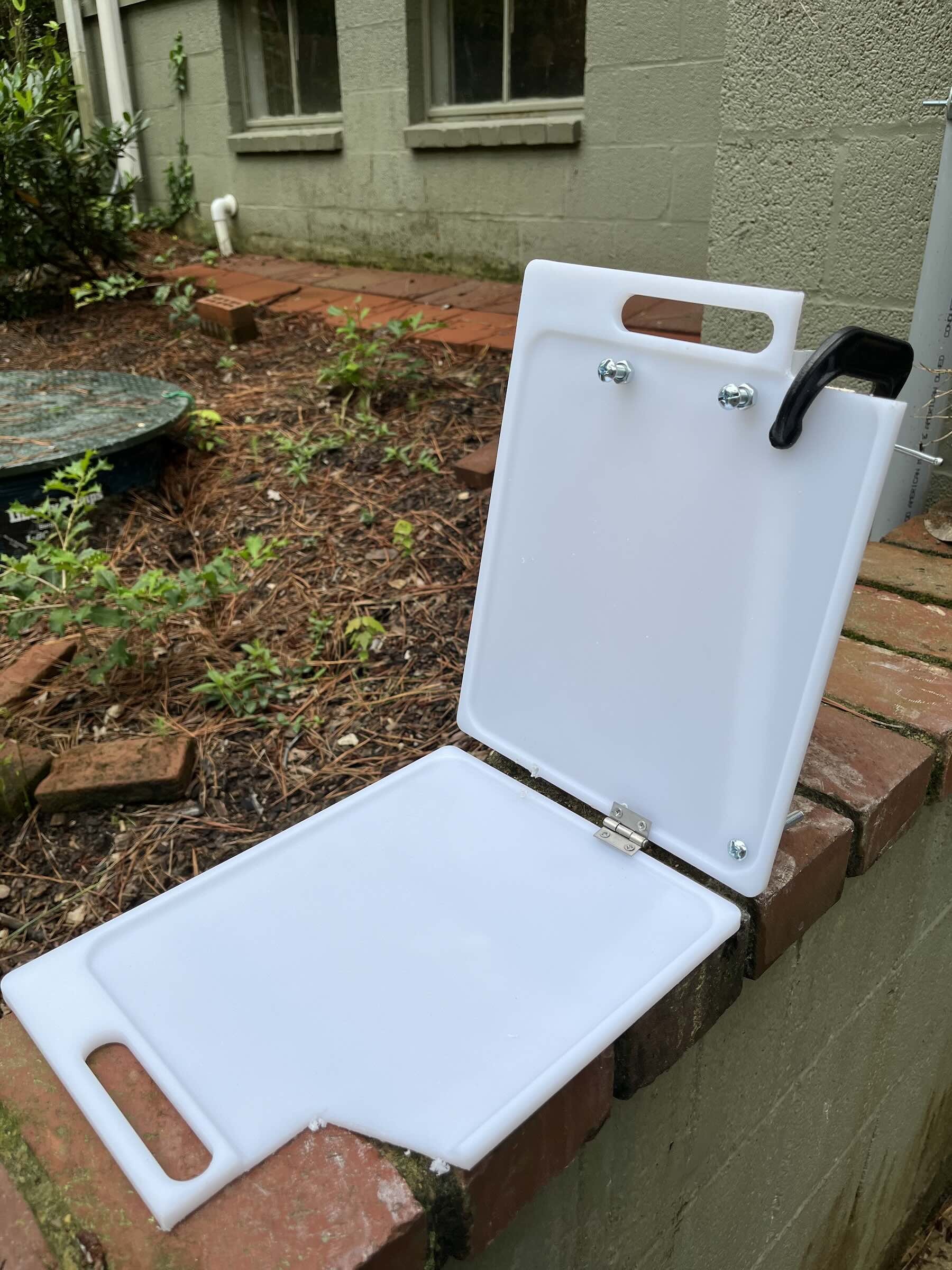 I opted to hinge two cutting boards together with the thinnest & smallest hinge I could find. The cutting boards are thin enough that the hinge screws stick through a little. I sawed off the tips, and the remaining slight protrusion actually helps keep the brick from sliding.