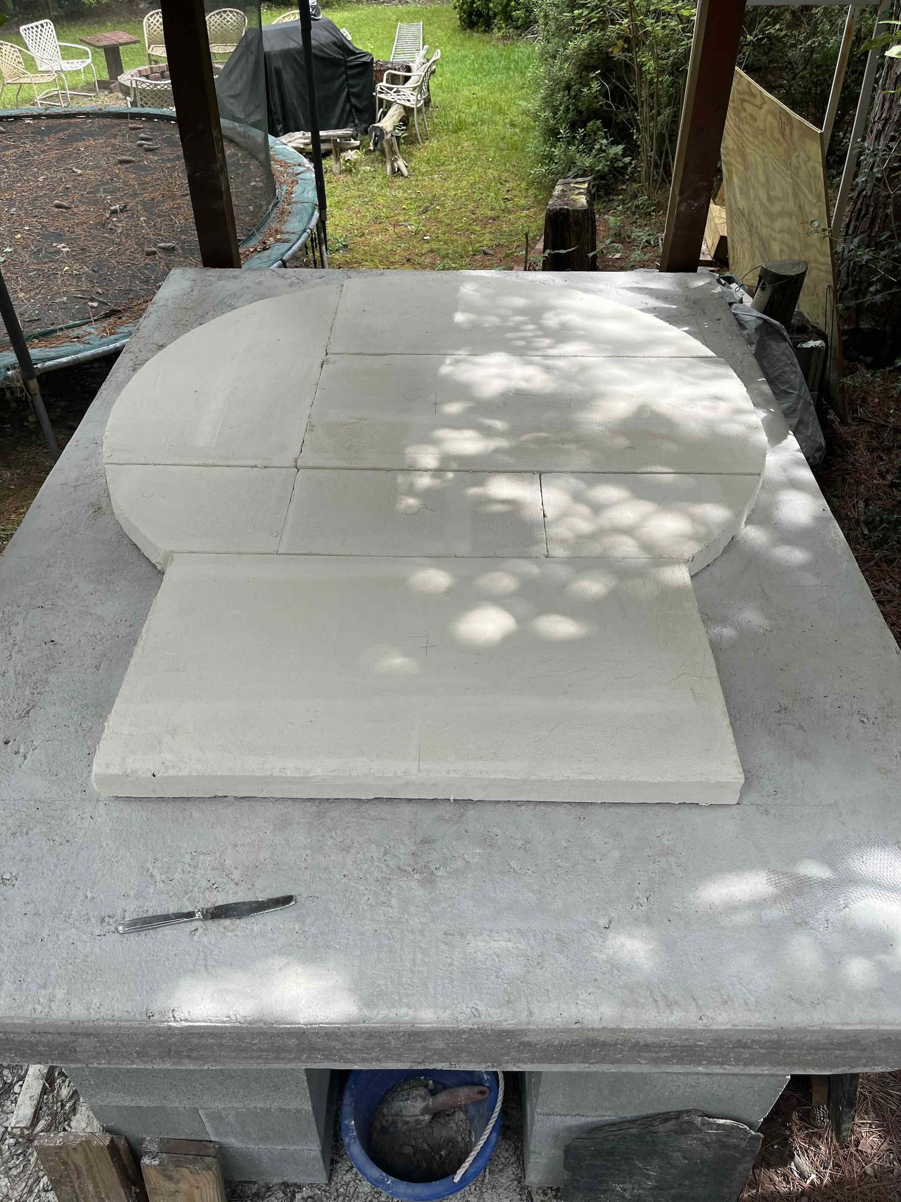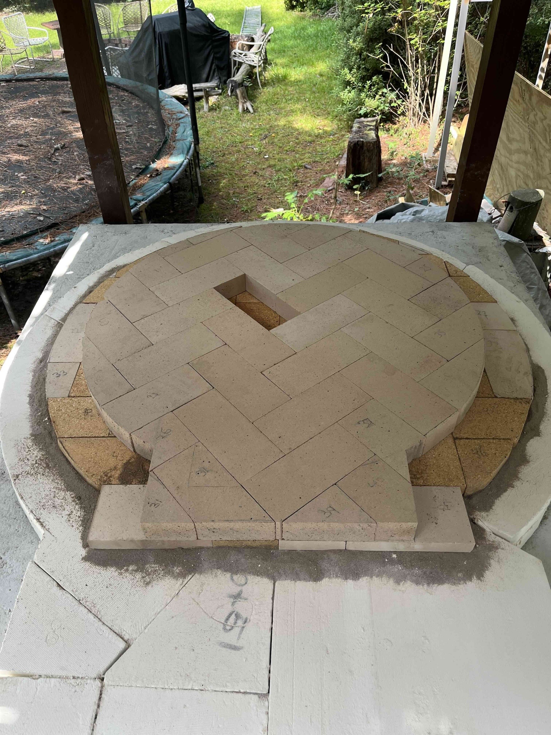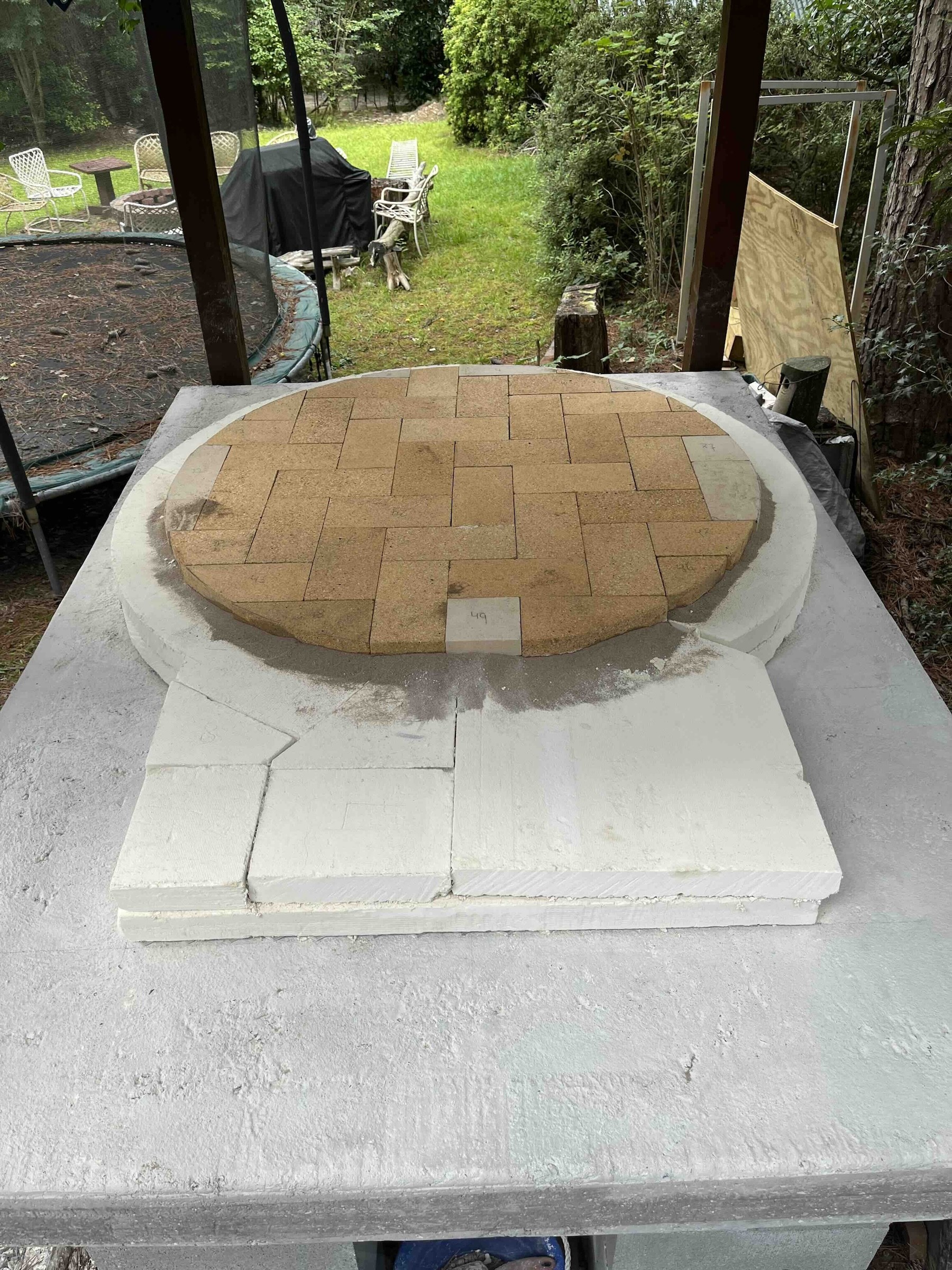 I opted to hinge two cutting boards together with the thinnest & smallest hinge I could find. The cutting boards are thin enough that the hinge screws stick through a little. I sawed off the tips, and the remaining slight protrusion actually helps keep the brick from sliding.
