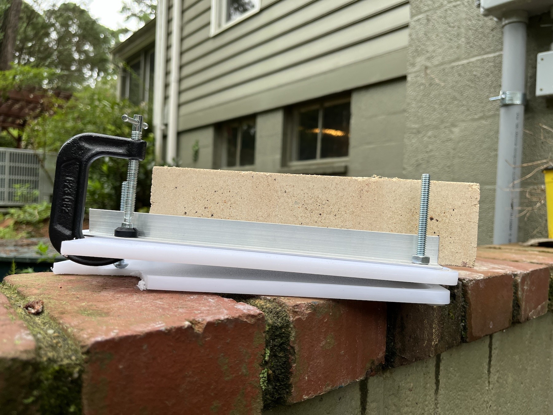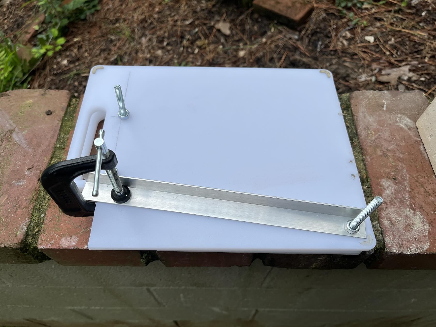 A small piece of 3/4" aluminium angle allows me to control the taper, with a C clamp fixing it in place. The C clamp obviously protrudes a bit below the top cutting board; this would potentially constrain how small an angle I can do for the bevel; fortunately, cutting away the bottom cutting board mostly takes care of this. I think I can get down to the angle I need (if not, I can always raise the whole jig on another flat piece of plywood).
