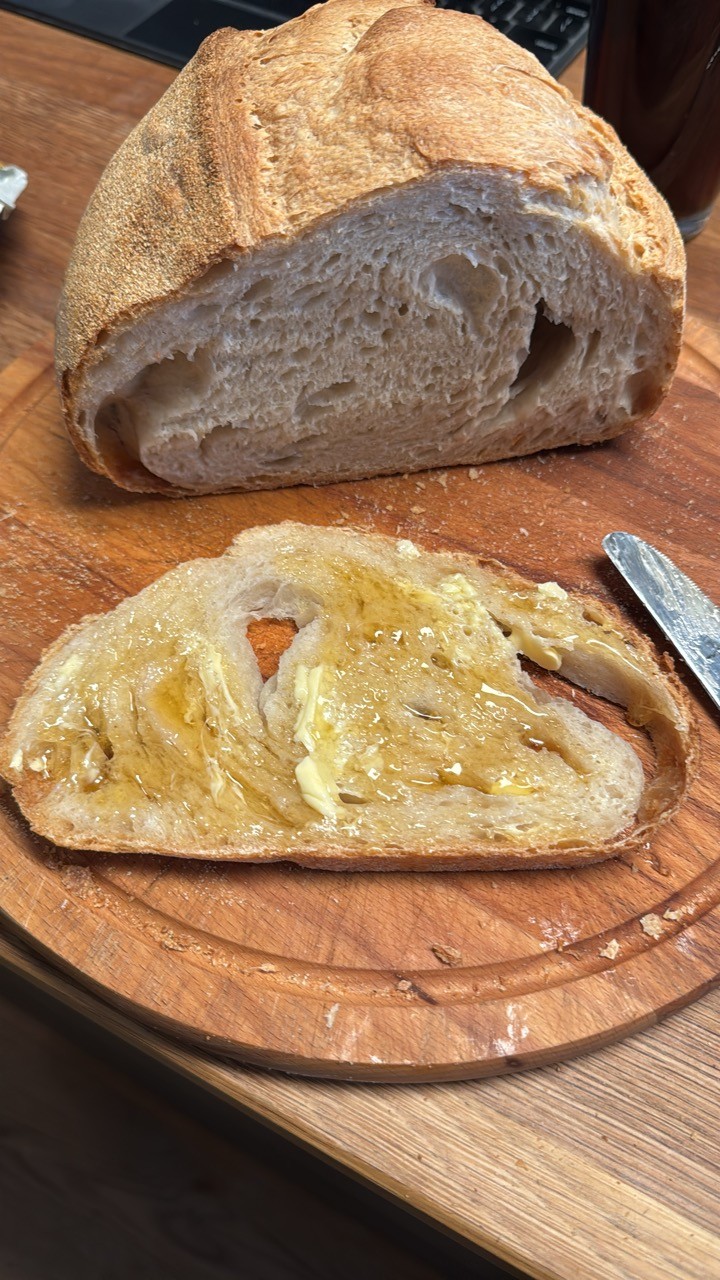 Yesterday I had 2 x 280g balls left over, so i let them proof another 24 hours and today I combined them and put them in a proofing basket. Baked it in the oven with the retained heat from last nights pizza bake.