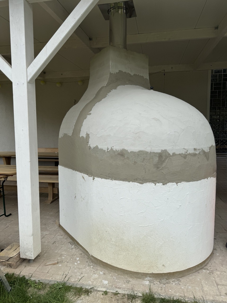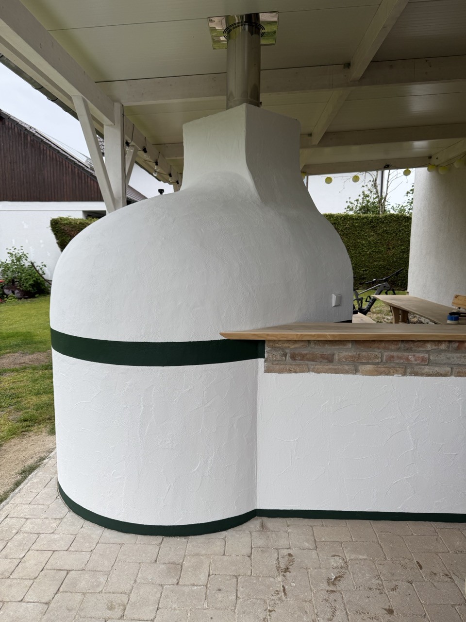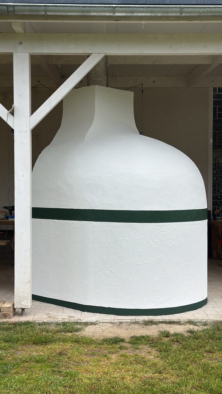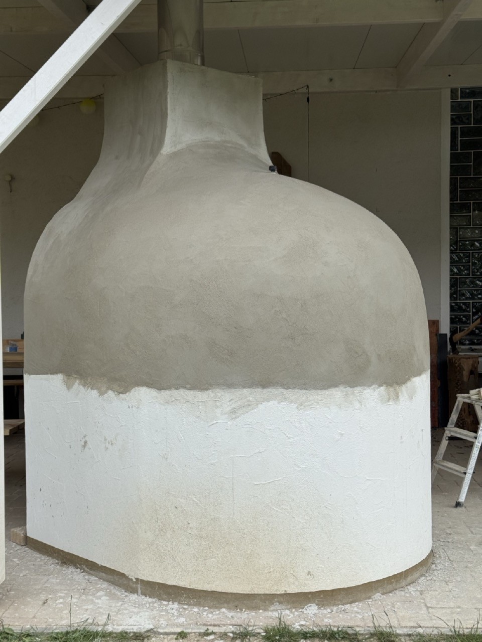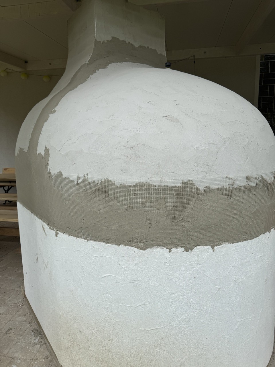 This last week I have been working on finishing the final layer of render on the dome. I incorporated nylon mesh where the dome render meets the base and the front chimney structure to reduce any cracking if there is movement. At last, a bit over a year after starting the oven the rendering is done. With the warm weather expected this week I should be able to paint it in about a week. Then I‘ll refit the Ash slab on the bar at the rear of the preparation bench top. FInishing the details is really fulfilling.