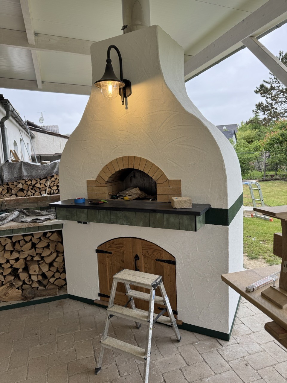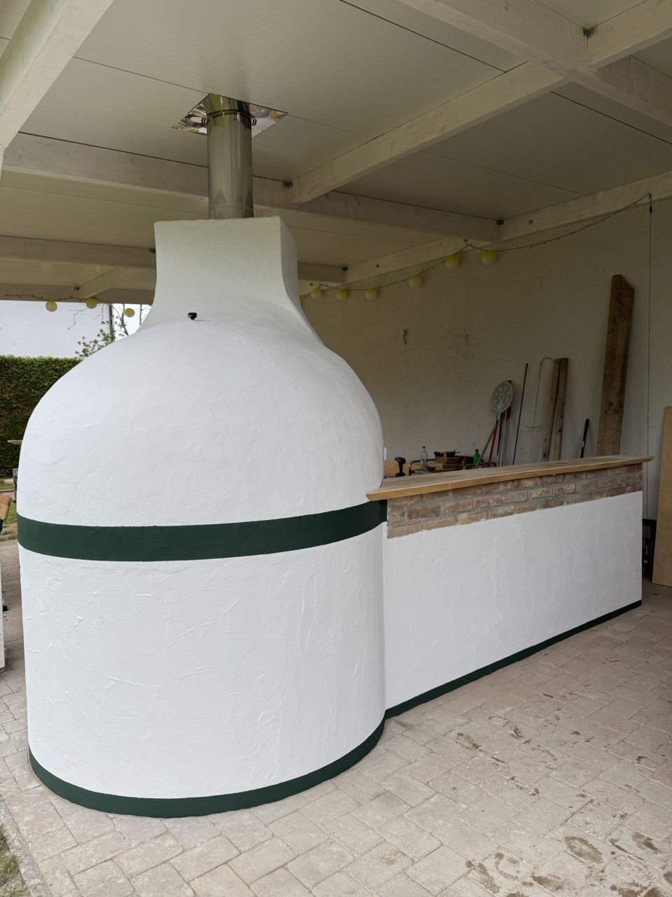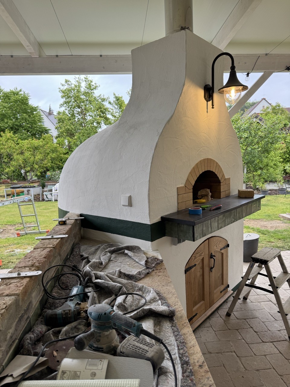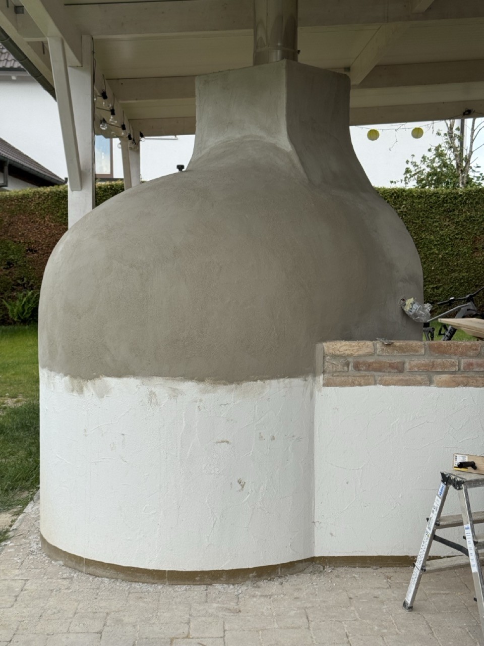 This last week I have been working on finishing the final layer of render on the dome. I incorporated nylon mesh where the dome render meets the base and the front chimney structure to reduce any cracking if there is movement. At last, a bit over a year after starting the oven the rendering is done. With the warm weather expected this week I should be able to paint it in about a week. Then I‘ll refit the Ash slab on the bar at the rear of the preparation bench top. FInishing the details is really fulfilling.