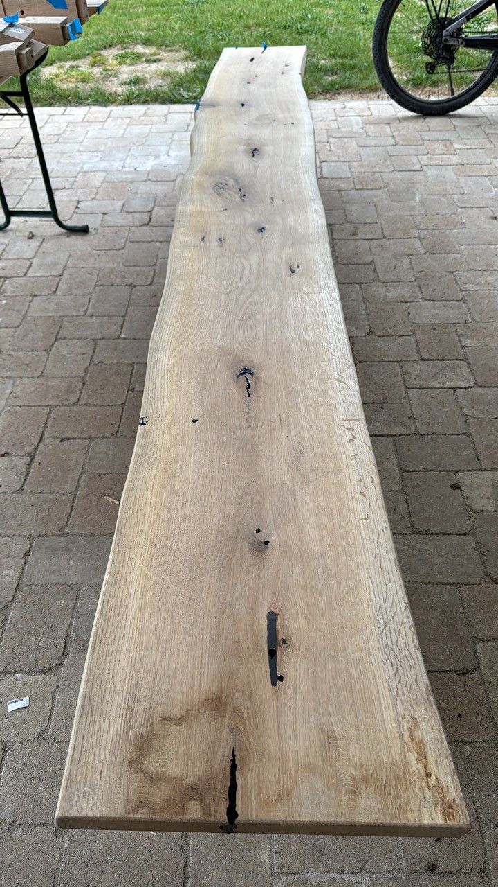 This week I also planned down some oak slabs and built to matching oak benches to go with the oak table. The oak is well seasoned, 13 years since it was cut. I have started filling cracks and blemishes with 2 part epoxy colored with black iron oxide. Its a tedious process, as I need to wait 24 hours after filling before being able to sand it flat, then move to a different side. Once the filling and sanding is finished, I can oil it.