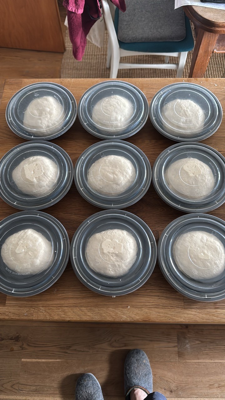 1. Super happy with the small re-usable containers I bought as they are the perfect size for the balls. Easy to handle, and I can fit 2 stacks of 5 in my fridge, whereas I can’t put a 60x40cm proofing tray in my fridge. I just paint th inside with a little olive oil, and the dough balls fall out into my semolina tray easily.