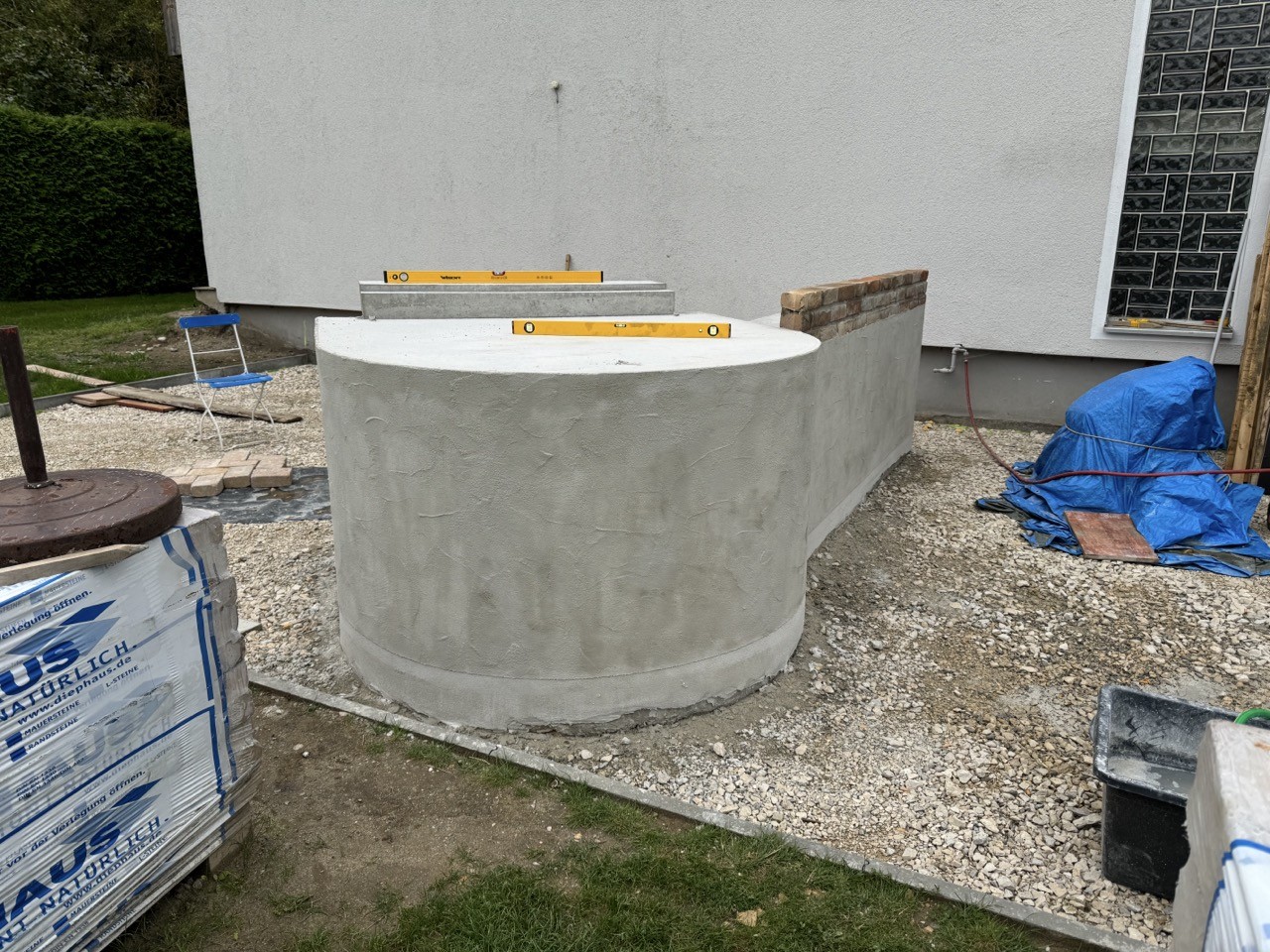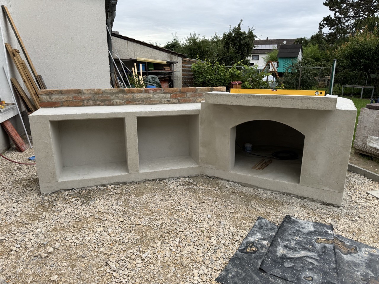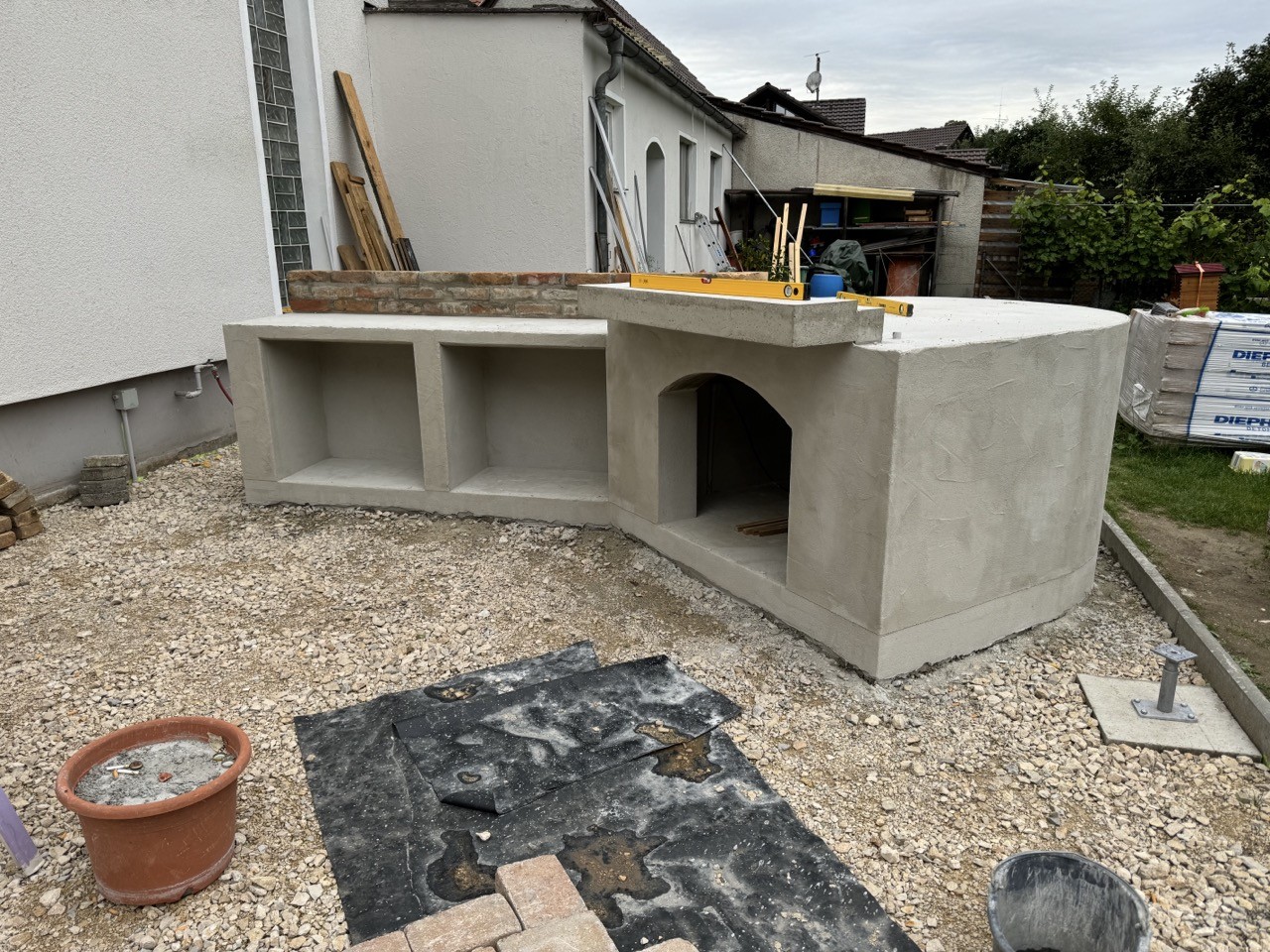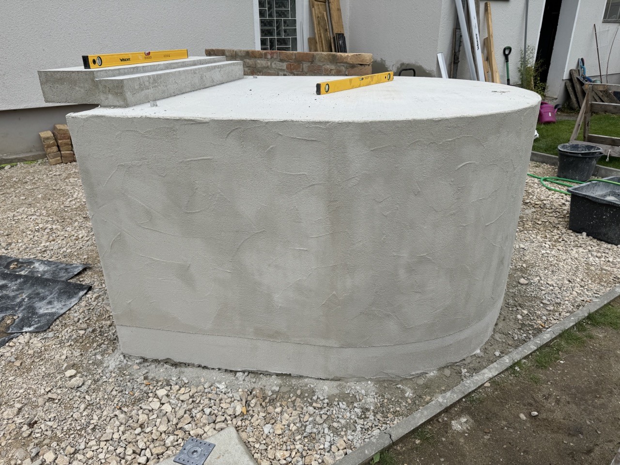 It’s been a really wet start to summer this year in Bavaria. When it rains it really pours, and it’s been really unpredictable. It’s been a bit hard getting a run at rendering oven stand, but today I finally managed to finish it. I’m going for a rustic theme with the finish, so visible washed out trowel marks are visible. I added a smooth skirting around the bottom that I will paint to match the okra color of the pavers.