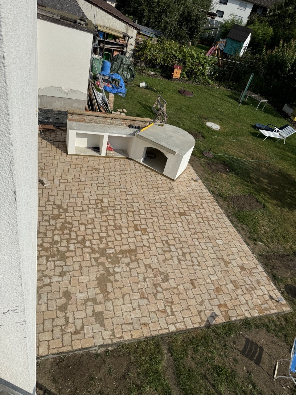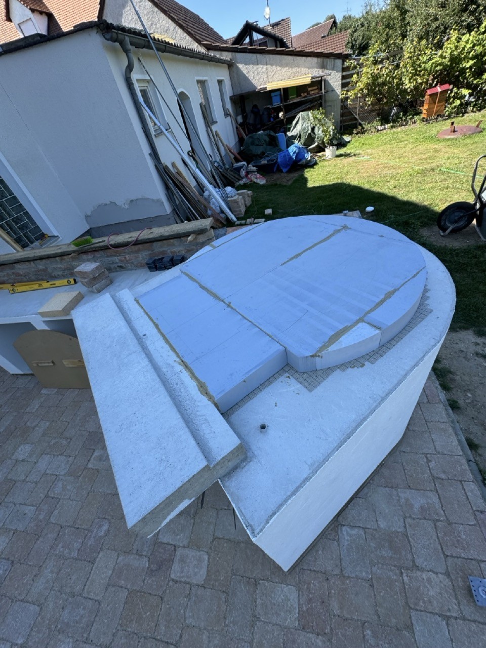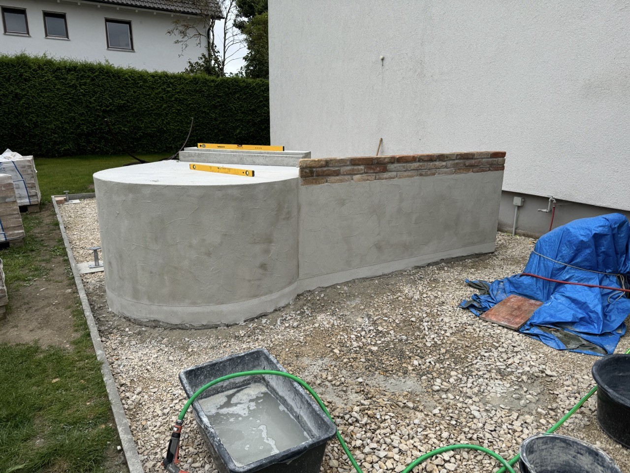 It’s been a really wet start to summer this year in Bavaria. When it rains it really pours, and it’s been really unpredictable. It’s been a bit hard getting a run at rendering oven stand, but today I finally managed to finish it. I’m going for a rustic theme with the finish, so visible washed out trowel marks are visible. I added a smooth skirting around the bottom that I will paint to match the okra color of the pavers.