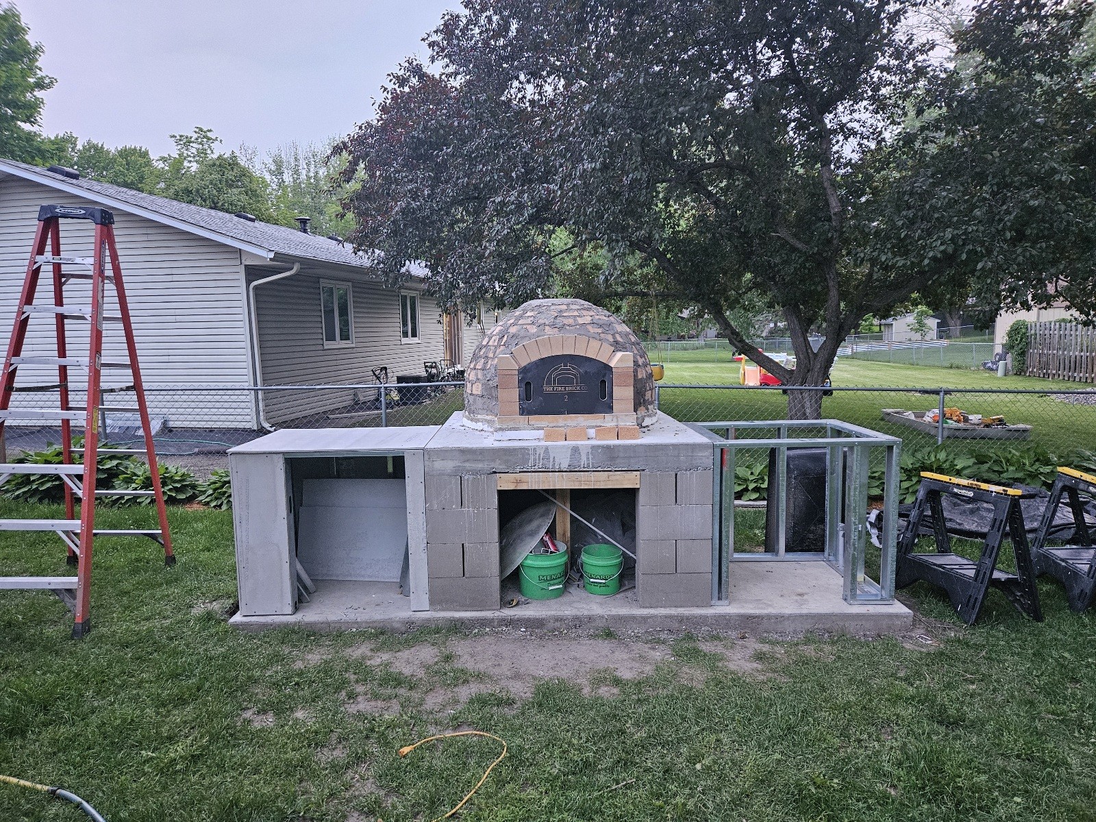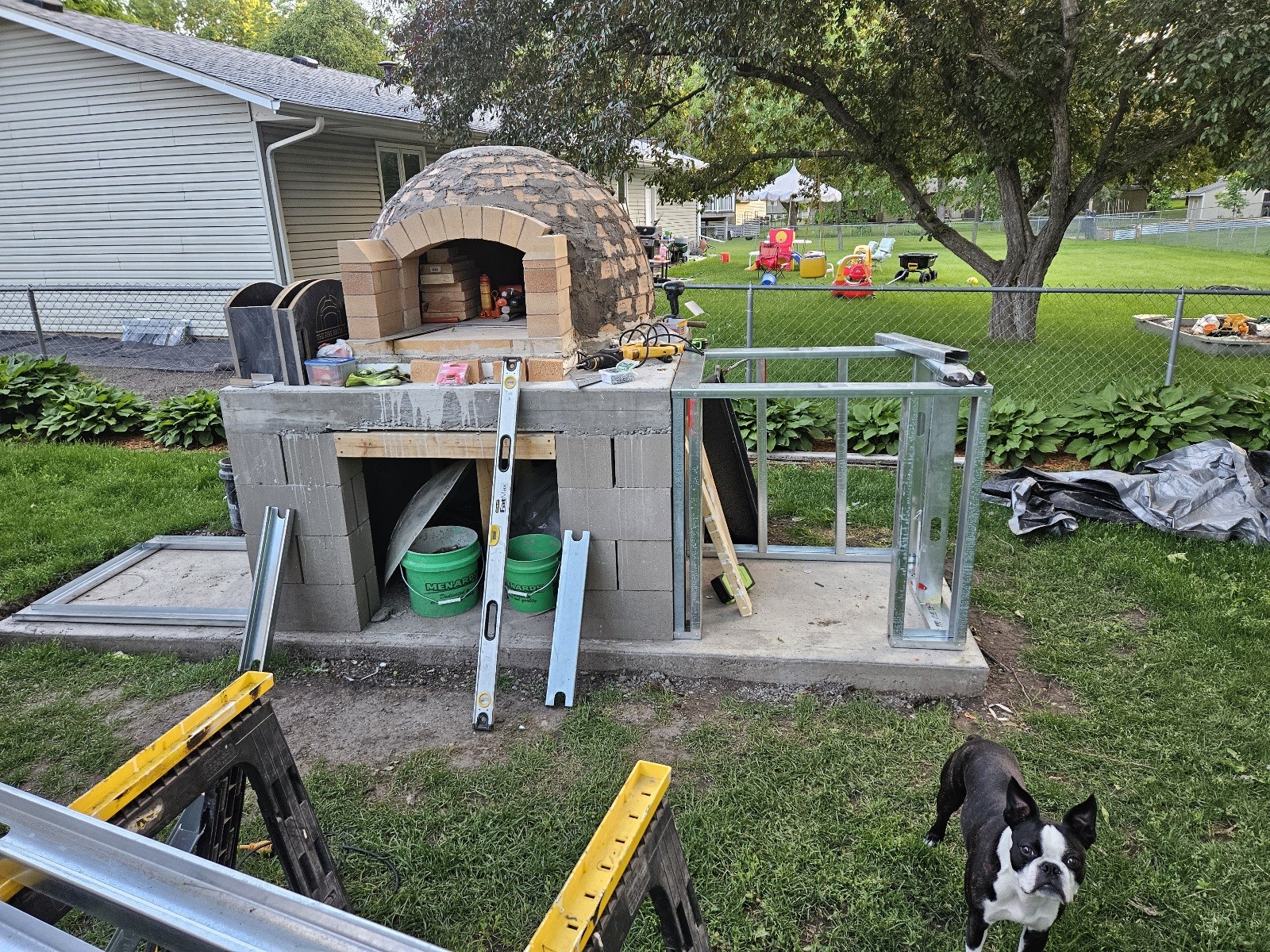 • Ok I managed to get a bit more done today. I finished cutting all the metal studs and got it all screwed together. It really surprises me just how solid these wings are. I realize that they are anchored on 2 sides into concrete but still. I am not sure I could budge them even if I put all my weight into it. And that was before I started putting the hardie backer on to it. That stuff is so heavy and dense it is unreal. Hopefully I will get a bit of time tomorrow to cover the other side and maybe put the front vent arch in place. And maybe the vent this weekend if I can get a bit of help. Once that is on I need to hammer out the insulation so I can get ready to pour the counter tops and start on the rendering. A few days after that I will be able to start the curring fires. I am also going to have to pick out a mini fridge and make a final decision about the stone veneer. I am about 99% sure I will end up doing the same kind and color as last time. Then build the pavilion and consider what to do for a walking area in front of the oven.