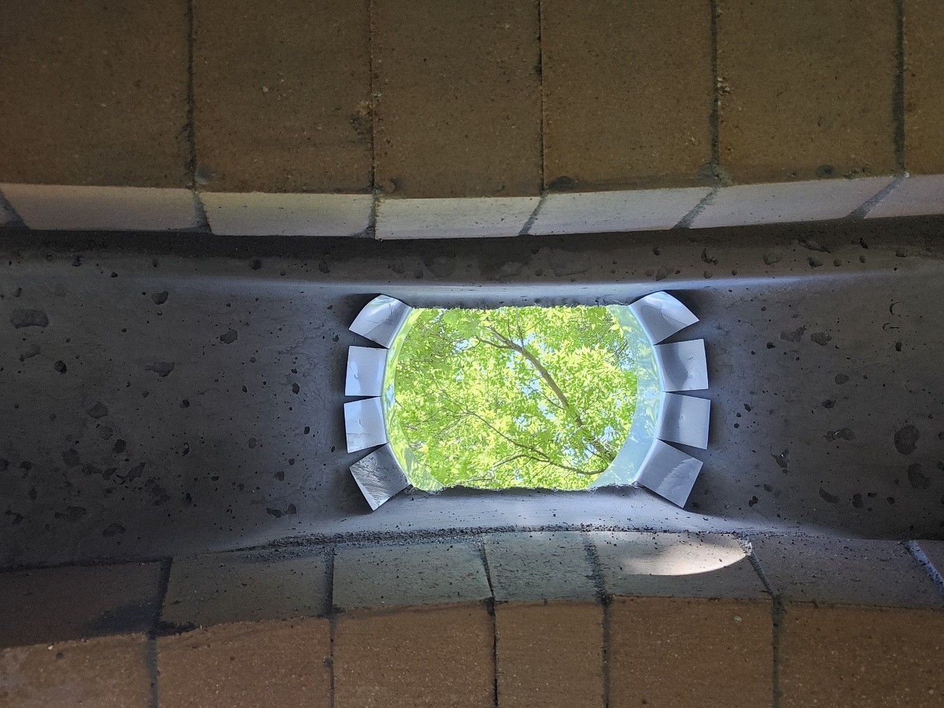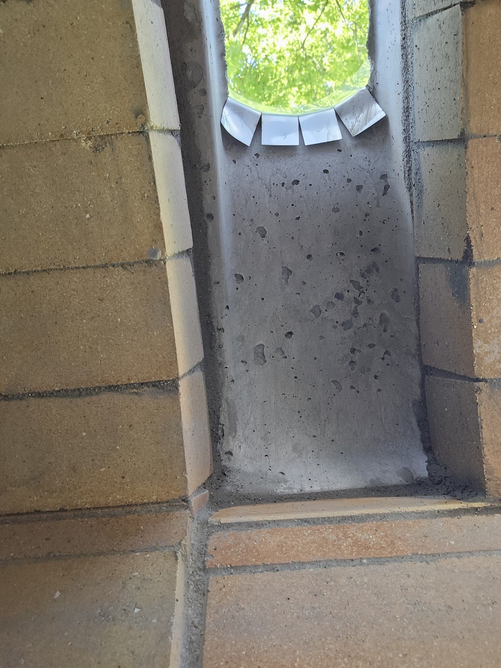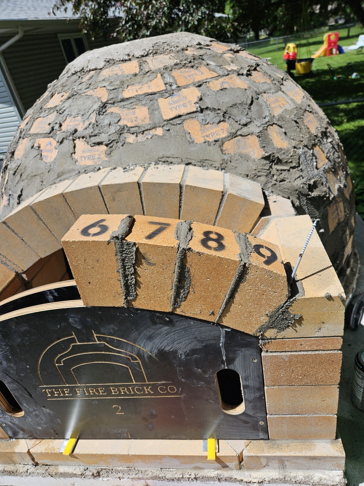 • I finally got around to laying the front vent arch this morning. It went together very nicely. I mixed the mortar a little wetter than I had been and everything squished out very nicely and allowed me to get everything together and even. Once that was all together I got impatient and finally broke down and called for a bit of help to put the vent into place. I was just not certain I could lift the thing into place by myself without bumping anything. Luckily with a friend's help I lifted the vent into place and got it all mortared in. It feels very good to have all the brick work donenow. I just looked back and I am almost 20 days ahead of last time at this date. I am hoping that I will make my deadline. I know it doesn't really matter but gives me a reason to keep pushing. Now according to the directions I need to wait for a full week to start the curring fire's.