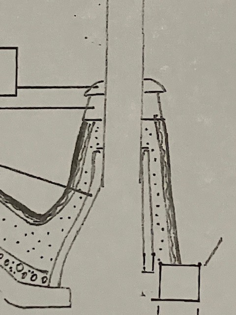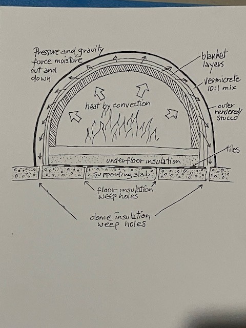 I think that the steam pressure at the top of the dome insulation can be utilized to push moisture down, assisted by gravity, so the drains are better placed in the supporting slab and aligned with the insulating layers. I now cast four extra holes in my precast supporting slab to facilitate this function.This also has the advantage of all drain holes being out of sight.