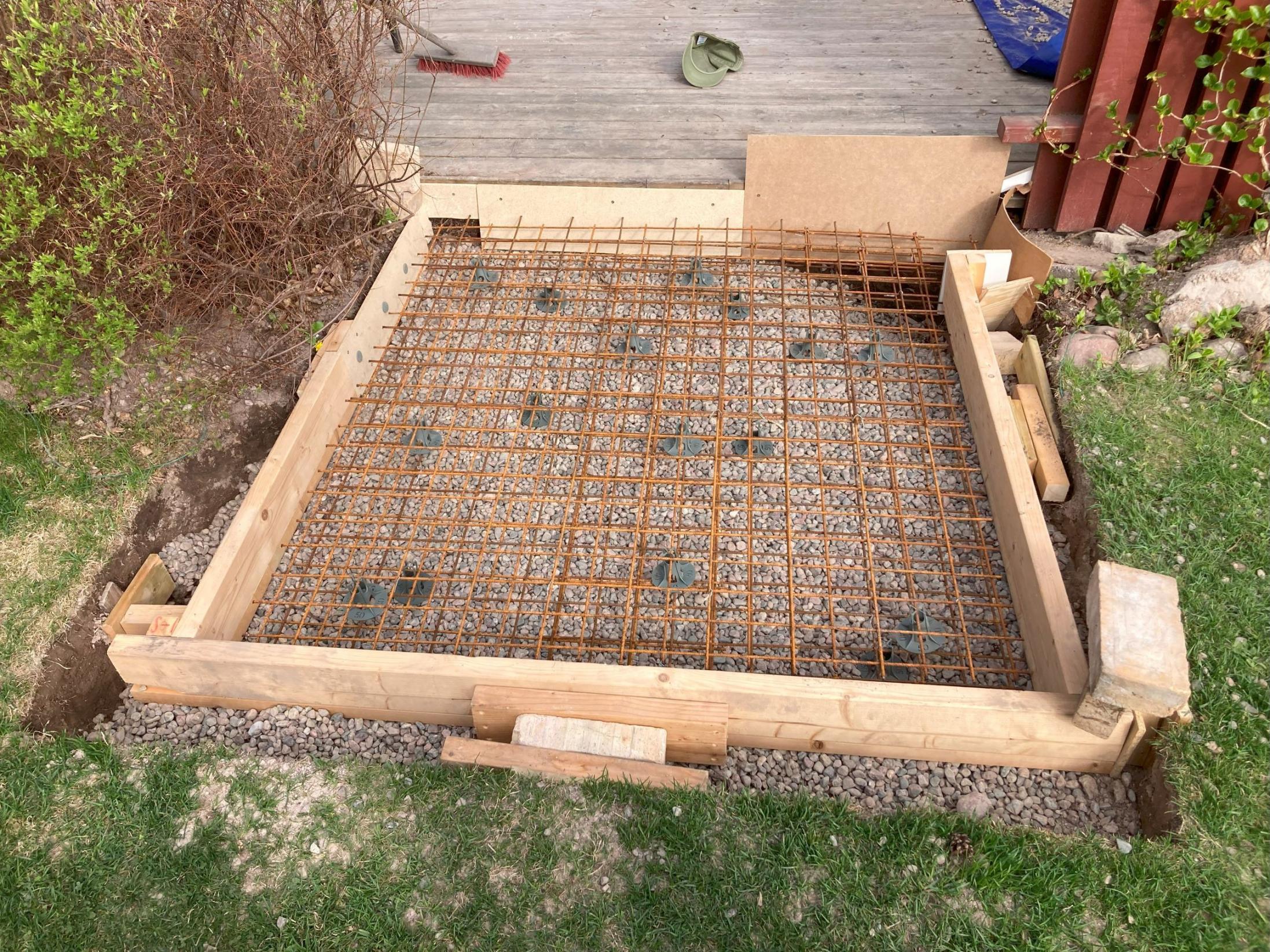I had originally thought to do concrete sacks to make the foundation and hearth slab easier. This turned out to be financially restrictive. I got rocks and sand from my local recycling center, bought cement/rebar, borrowed a drum mixer from a neighbor and poured the foundation and slab that way. I'm a structural engineer by trade so I was able to calculate the reinforcement I needed.