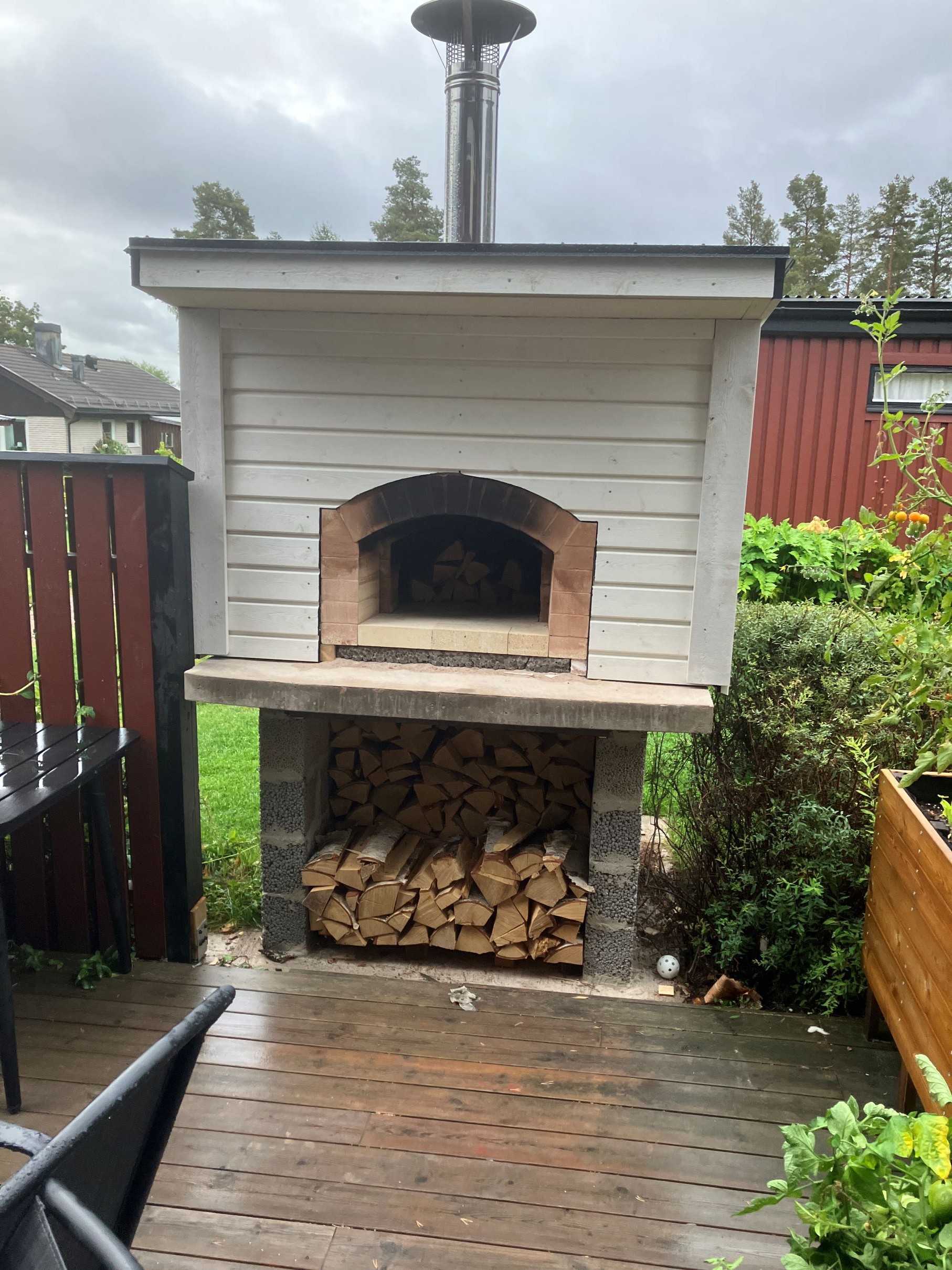 When the oven is up to temperature I place smaller pieces either side of the entry to feed the fire on the side. Using this method means they burst into flame almost immediately.