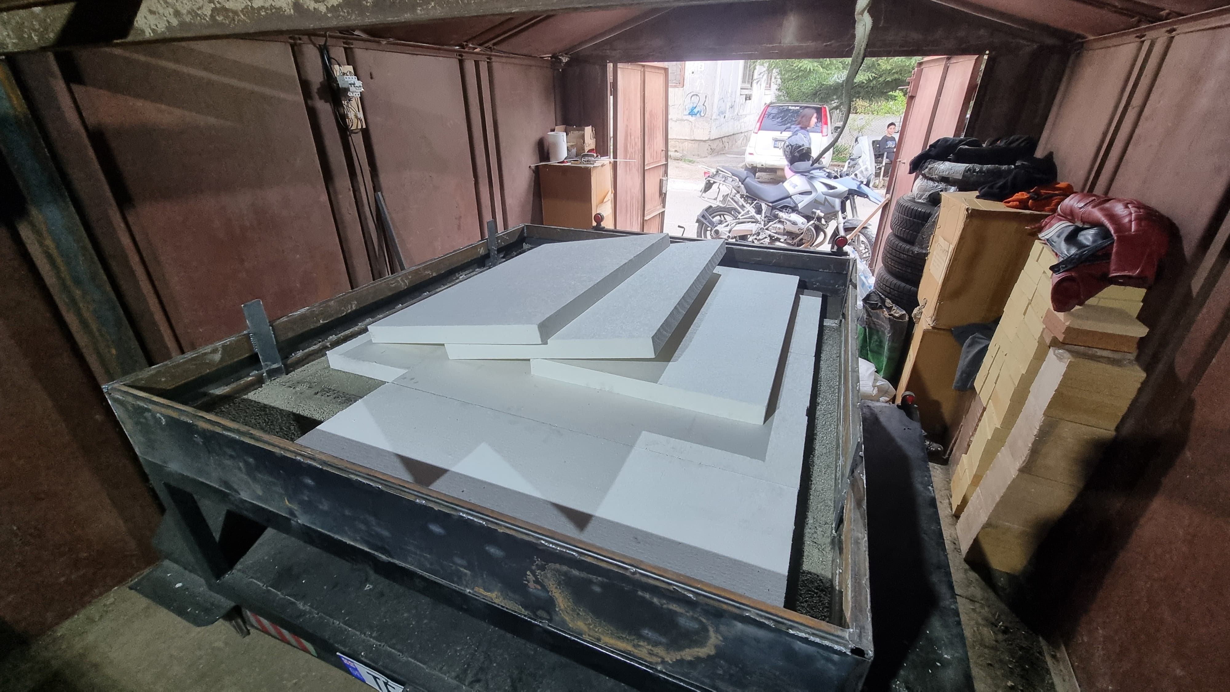 The plan is to have a thick oven floor of about 8cm (Thick bricks, then 2.5cm big Floor tiles on top), all insulated with ceramic fibreboard, later Perlcrete and then stell cage - laying on something like a tire to balance shock. The trailor has a suspension, but still. more is more.