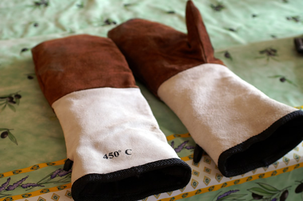 I bought a cheap pair of welder's gloves from Harbor Freight to protect my hands from the intense heat of our cob oven. They didn't impress me -- I had to use regular kitchen hot pads plus the gloves to extract a small dutch oven.