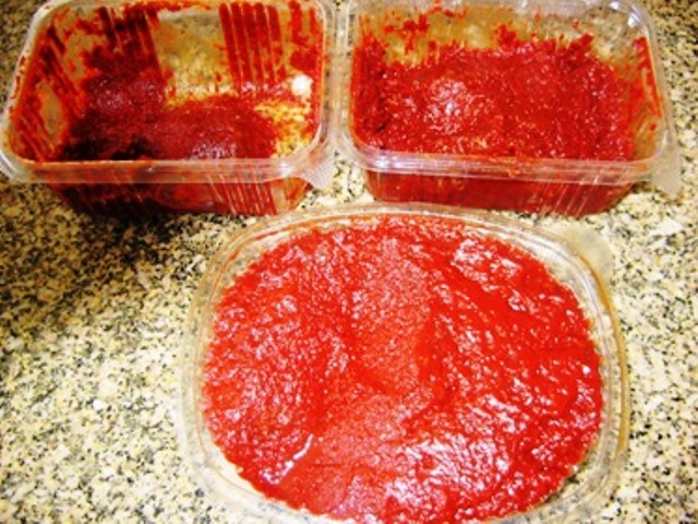 It is bought by weight, I find 1/2 Kilo or 1.1 pound to be best for us. It comes in 3 variations. The bottom one is tomato salca used in all recipes to reinforce tomato falvour. The top left is 'aci biber salca'. To be used sparingly as it is made with very hot chilli. The top right is 'tatli biber salca' which is made with mild or sweet chillis. This I use where chilli flavor is wanted without the heat. As in pepper sauces etc.