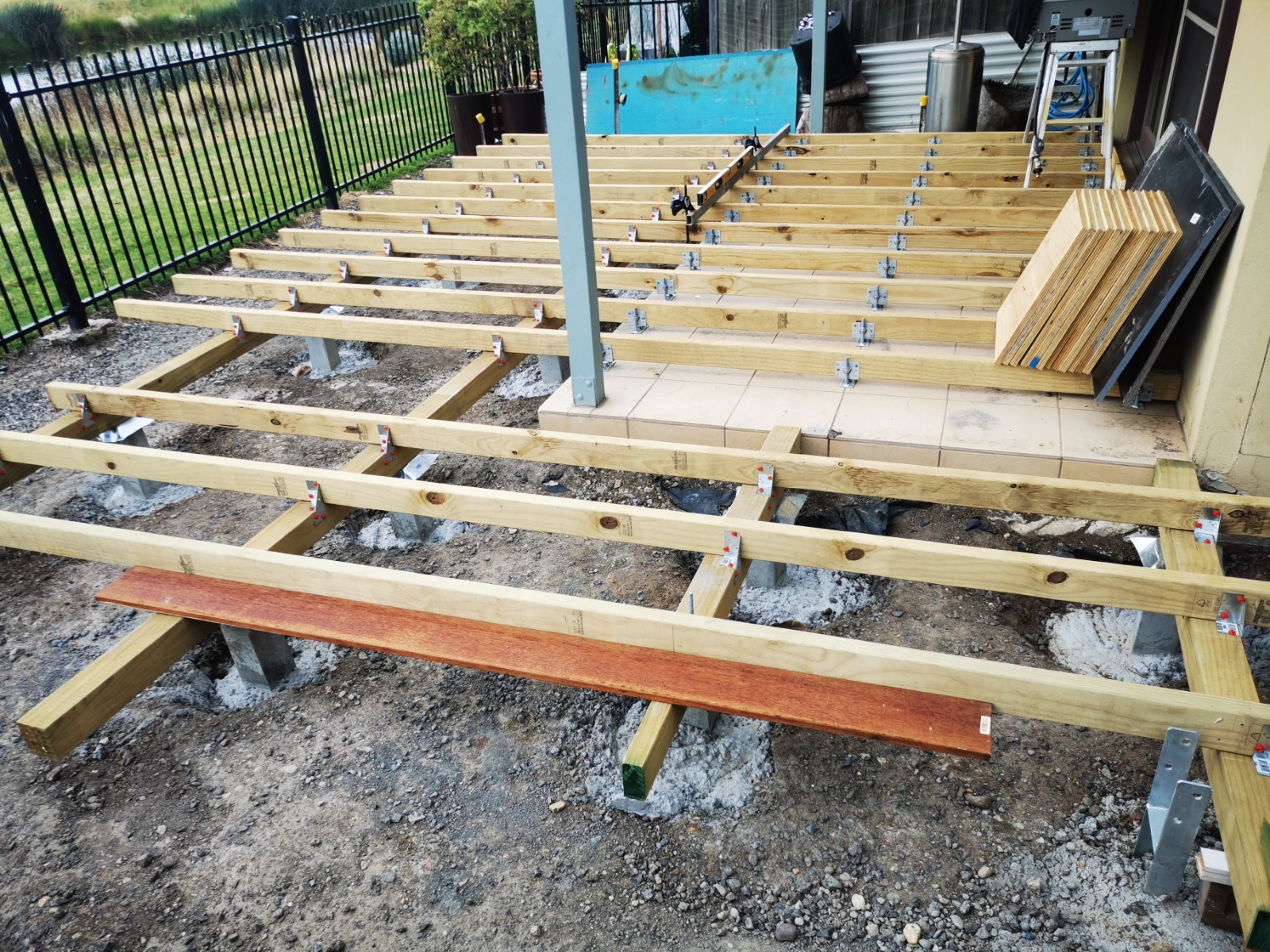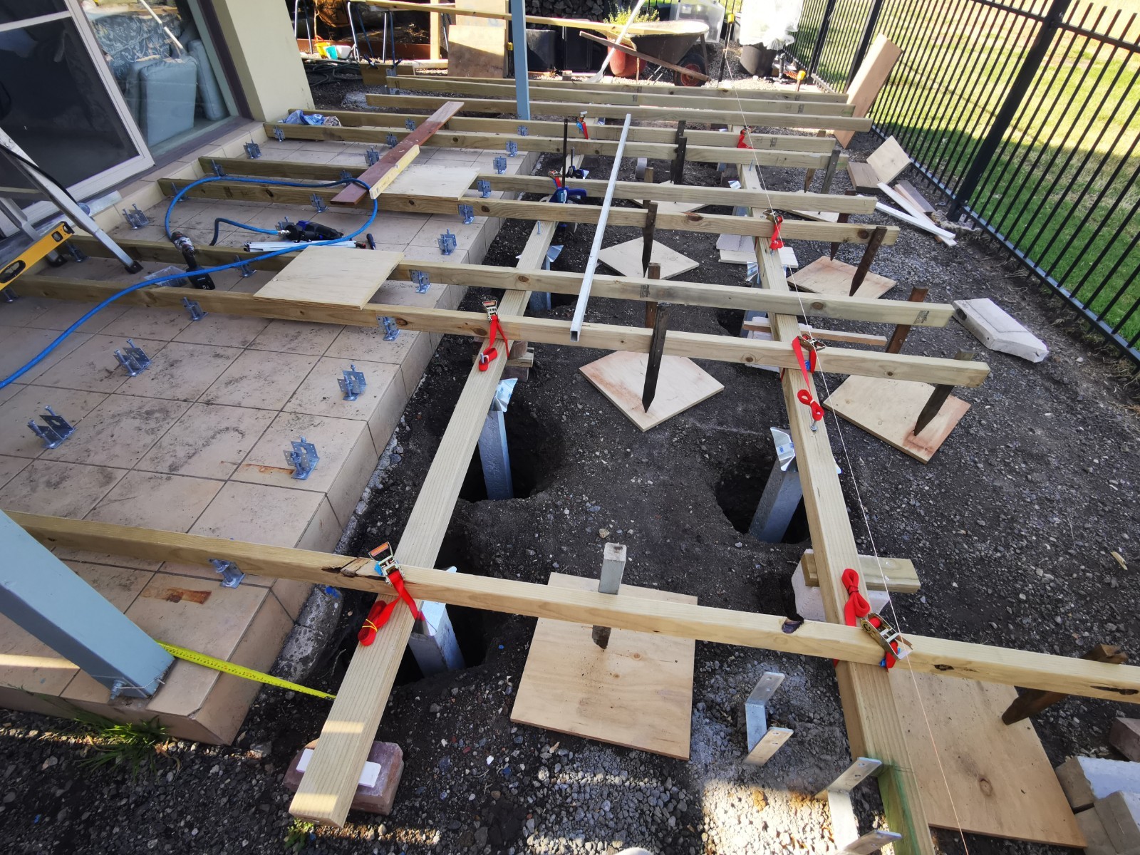 Oven is pretty much on hold as I have had to begin construction on our Verandah and Deck. As my partner son's landscaping team have completed all the holes for the verandah posts and deck stumps. I have managed to get these concreted and all jbearers and oists installed for the deck. This weekend managed to get 6 posts installed with 2 left to install.