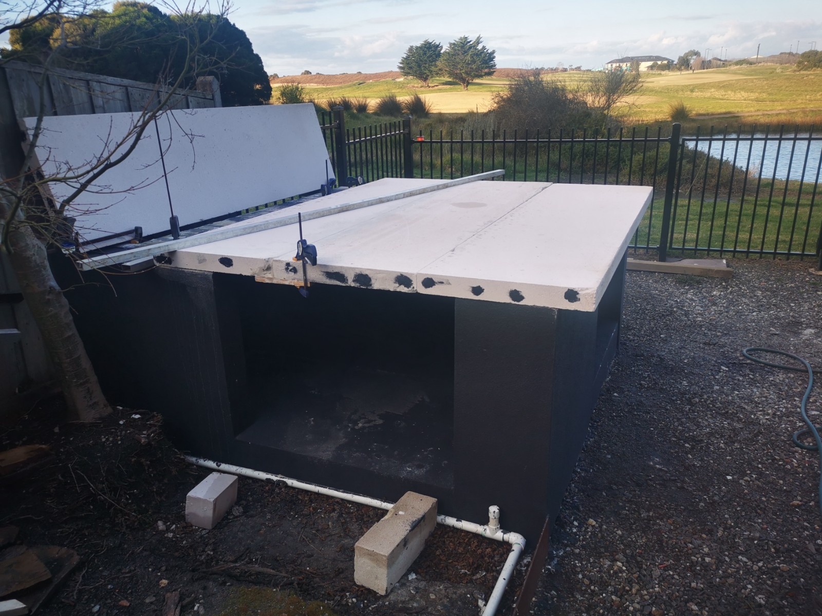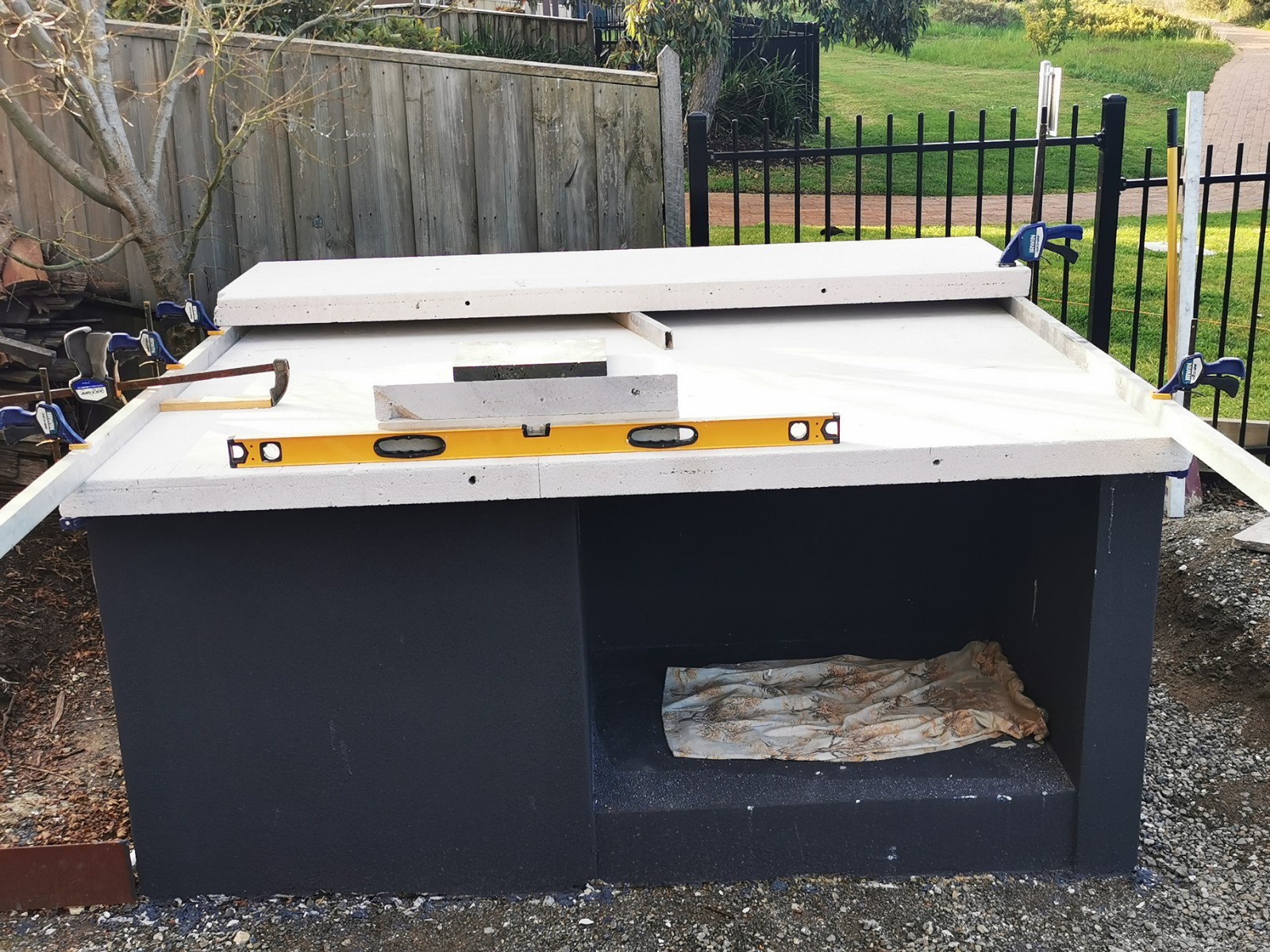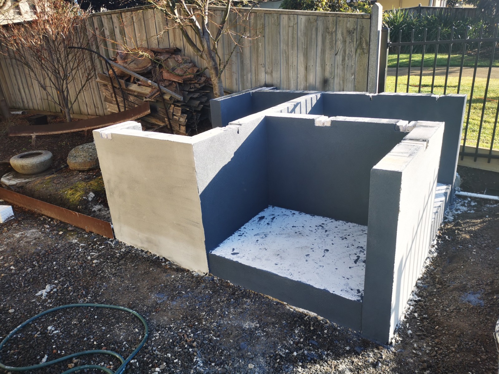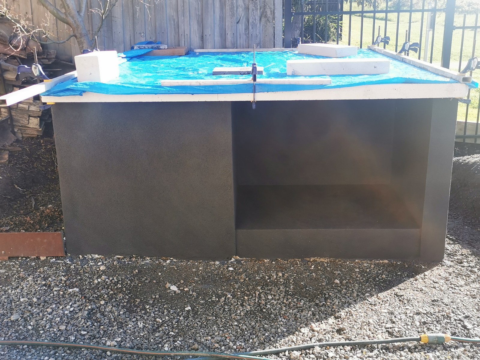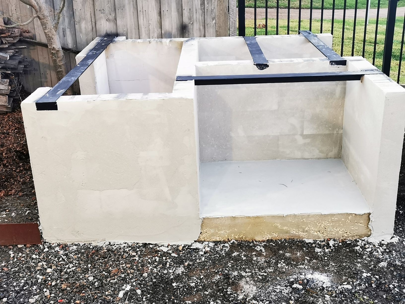 Yes, onto it. I have 4 power panels sitting on my front porch. picked up for $40 each bargain. The whole base will be rendered and sealed. Cant seal the tops of blocks, as the adhesive has to bond to the panels and blocks to create a solid monolithic structure. I did lay a damp course between concrete and the first course of Hebel. Pretty much same as first oven just bigger.