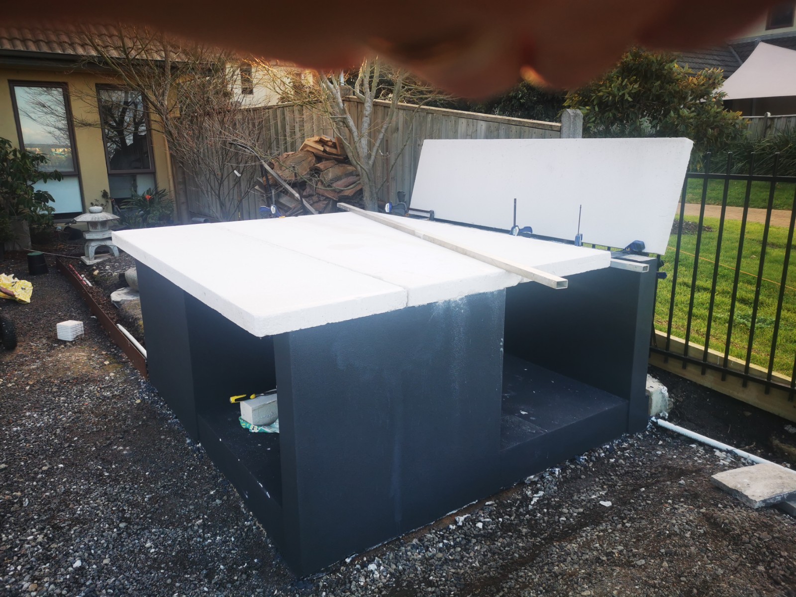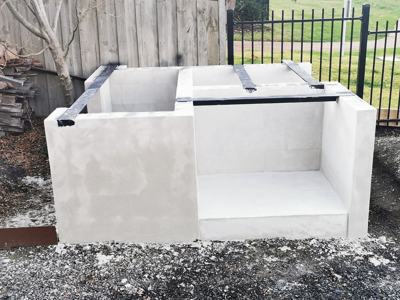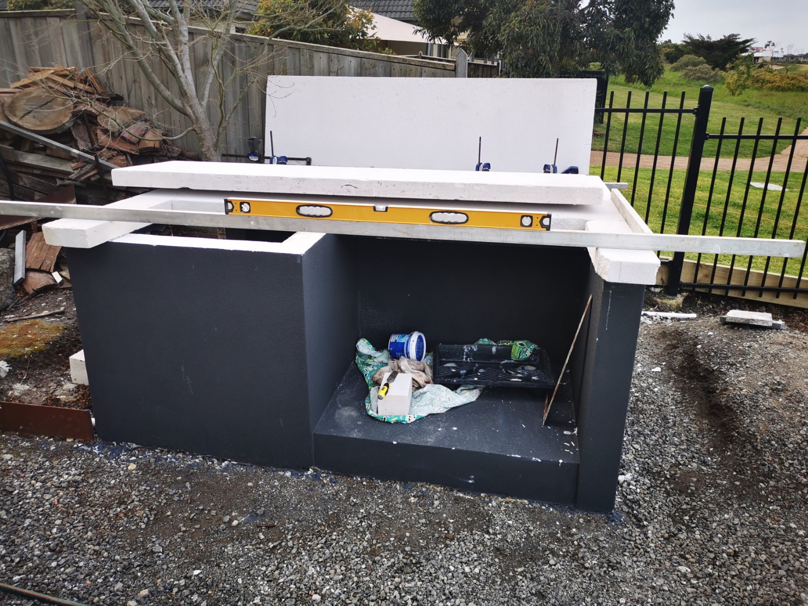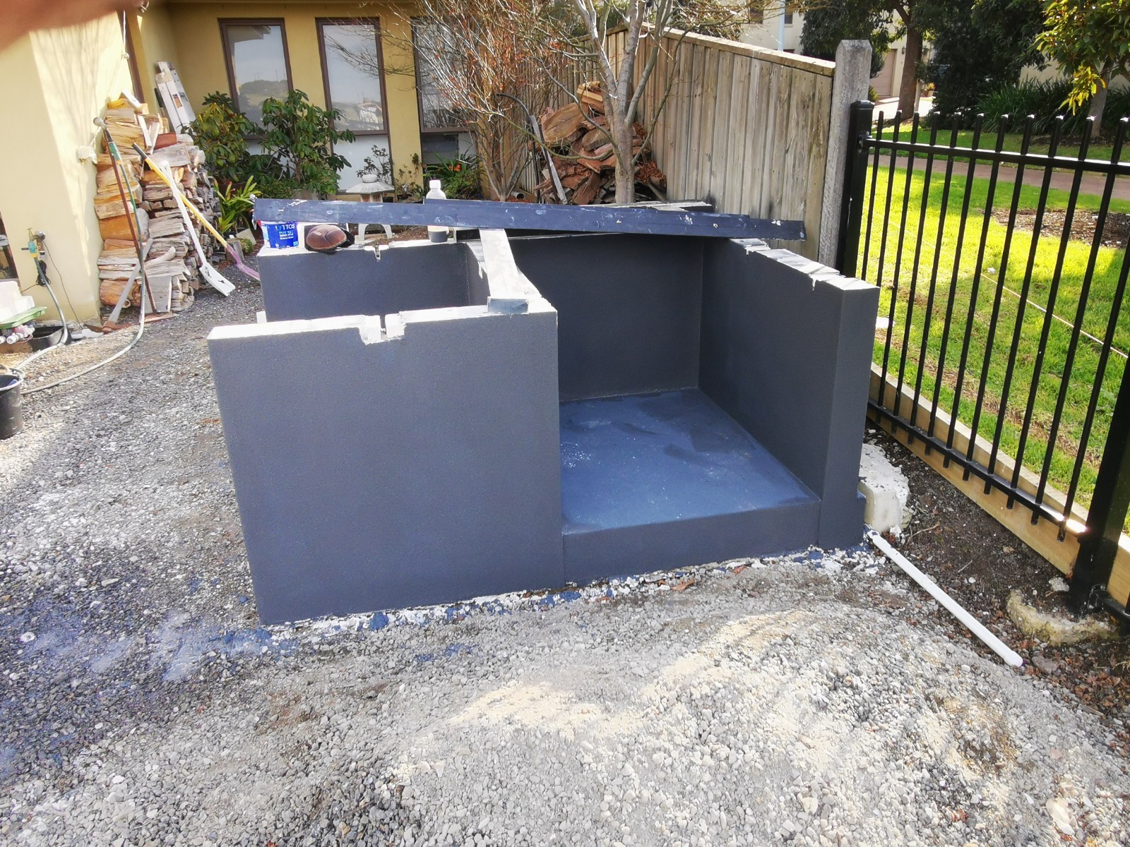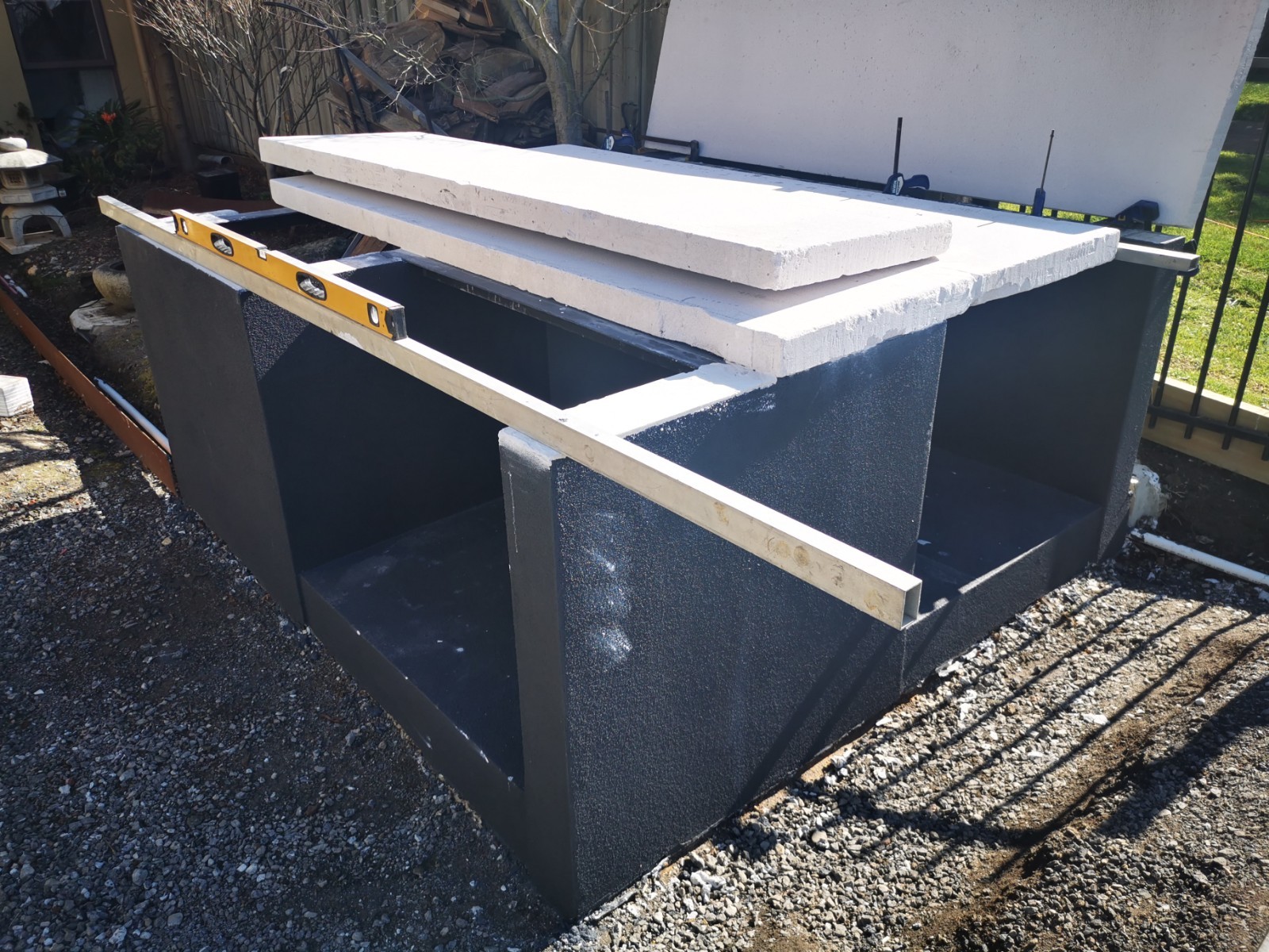 Yes, onto it. I have 4 power panels sitting on my front porch. picked up for $40 each bargain. The whole base will be rendered and sealed. Cant seal the tops of blocks, as the adhesive has to bond to the panels and blocks to create a solid monolithic structure. I did lay a damp course between concrete and the first course of Hebel. Pretty much same as first oven just bigger.