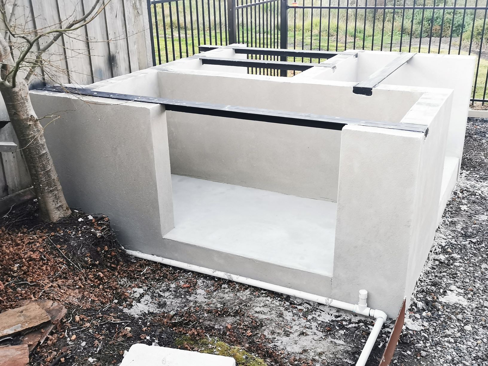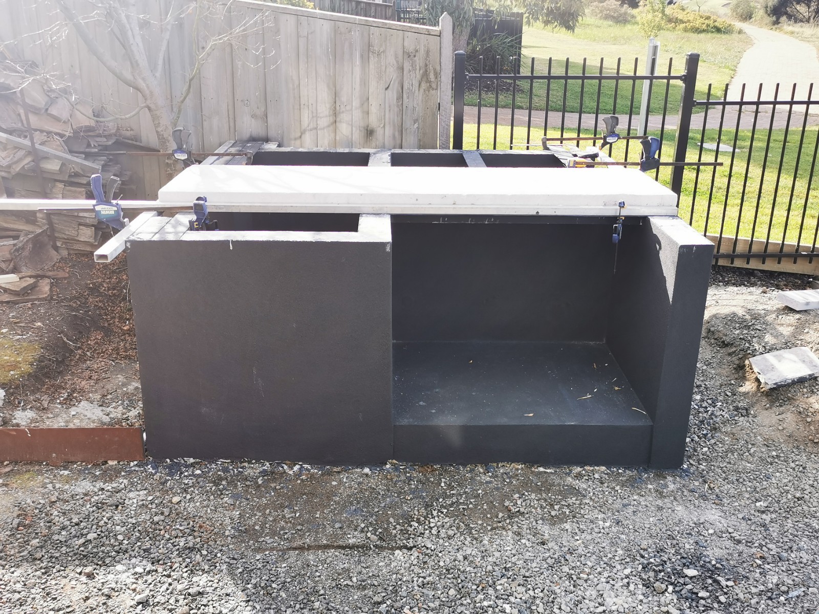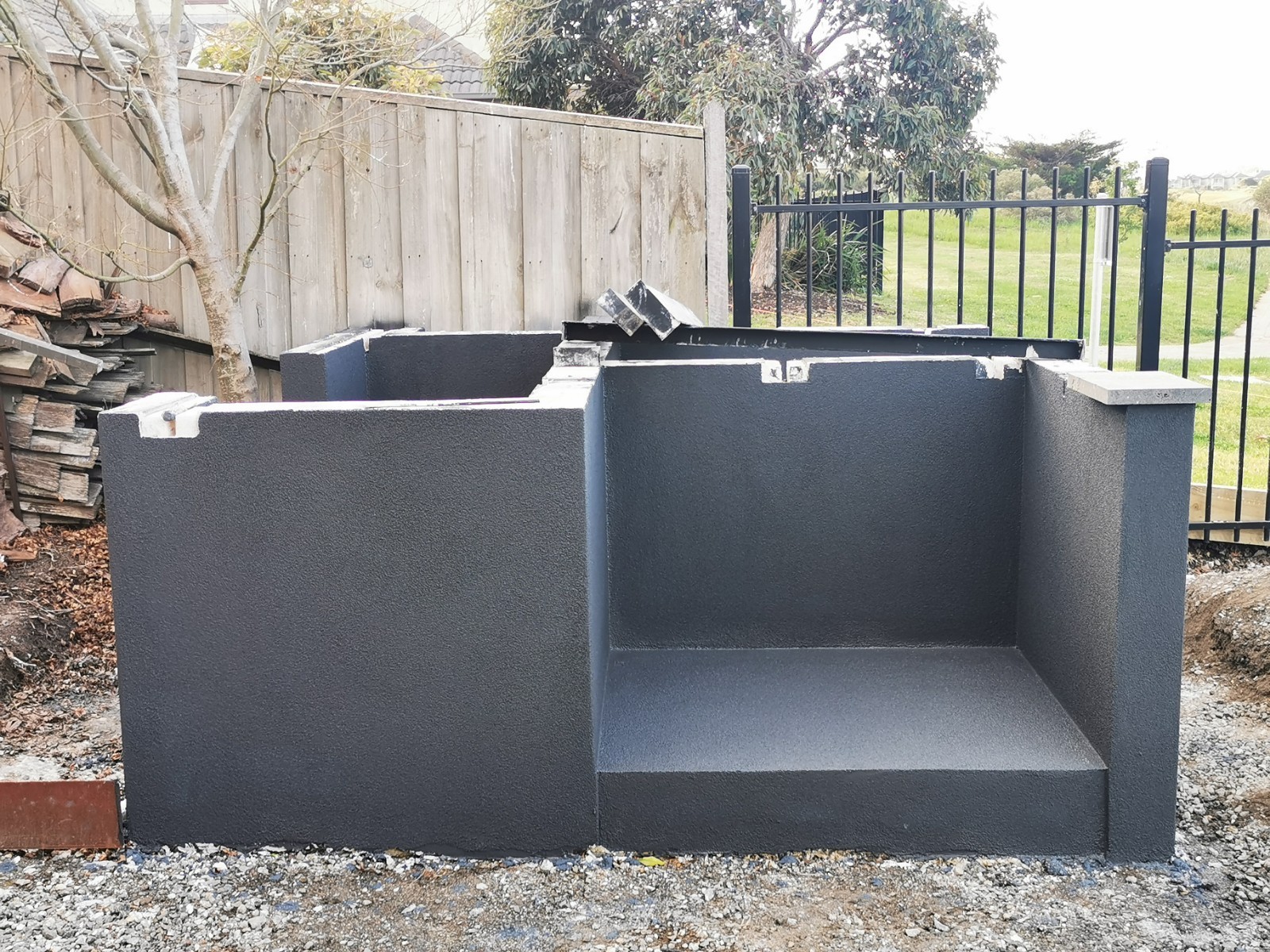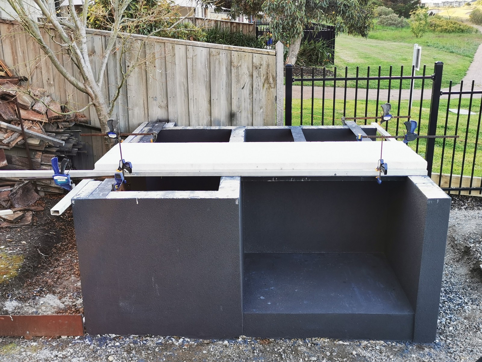 Yes, onto it. I have 4 power panels sitting on my front porch. picked up for $40 each bargain. The whole base will be rendered and sealed. Cant seal the tops of blocks, as the adhesive has to bond to the panels and blocks to create a solid monolithic structure. I did lay a damp course between concrete and the first course of Hebel. Pretty much same as first oven just bigger.
