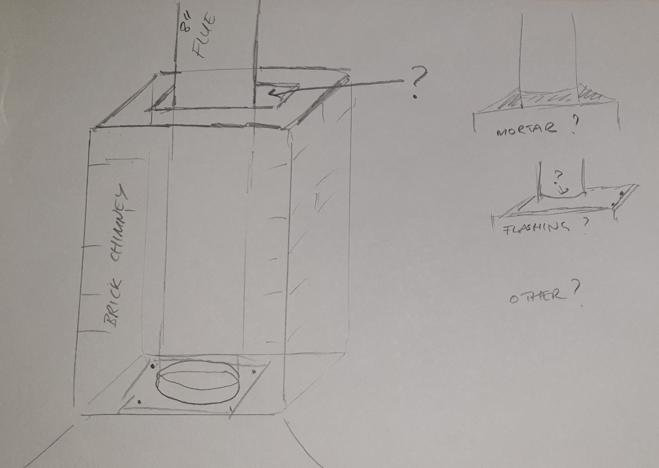 I am building my brick chimney and wondering how I finish the top of it, I am putting an anchor plate about 700mm above oven floor with 8" flue coming off it 2 mtrs high, I will build bricks up a few courses above anchor plate but I am just wondering what my options are for enclosing the flue at the top of bricks, I will attach my rough sketch.