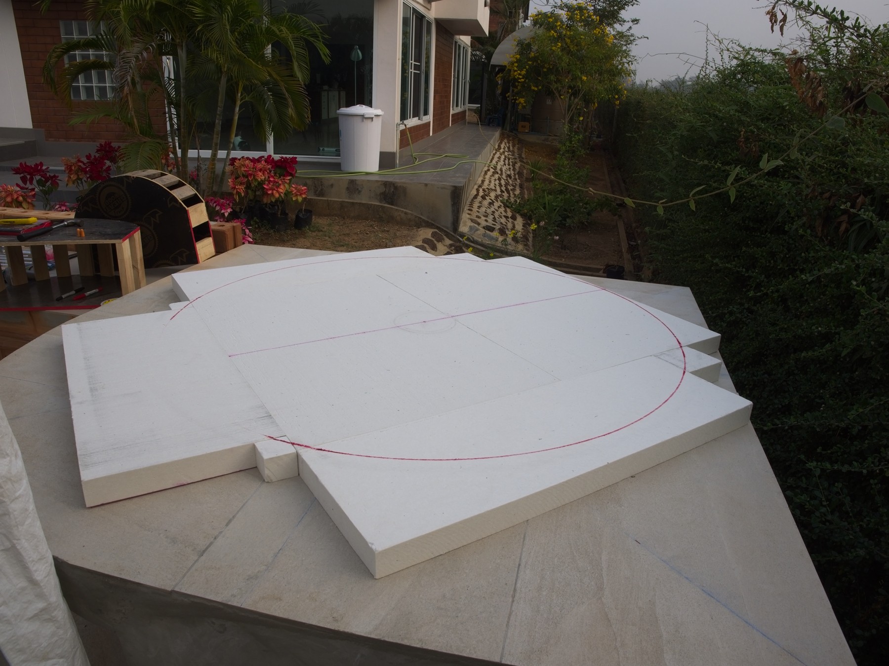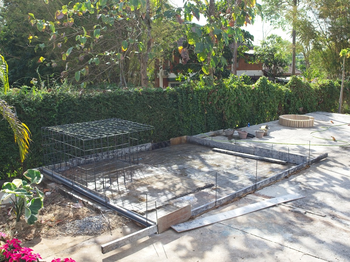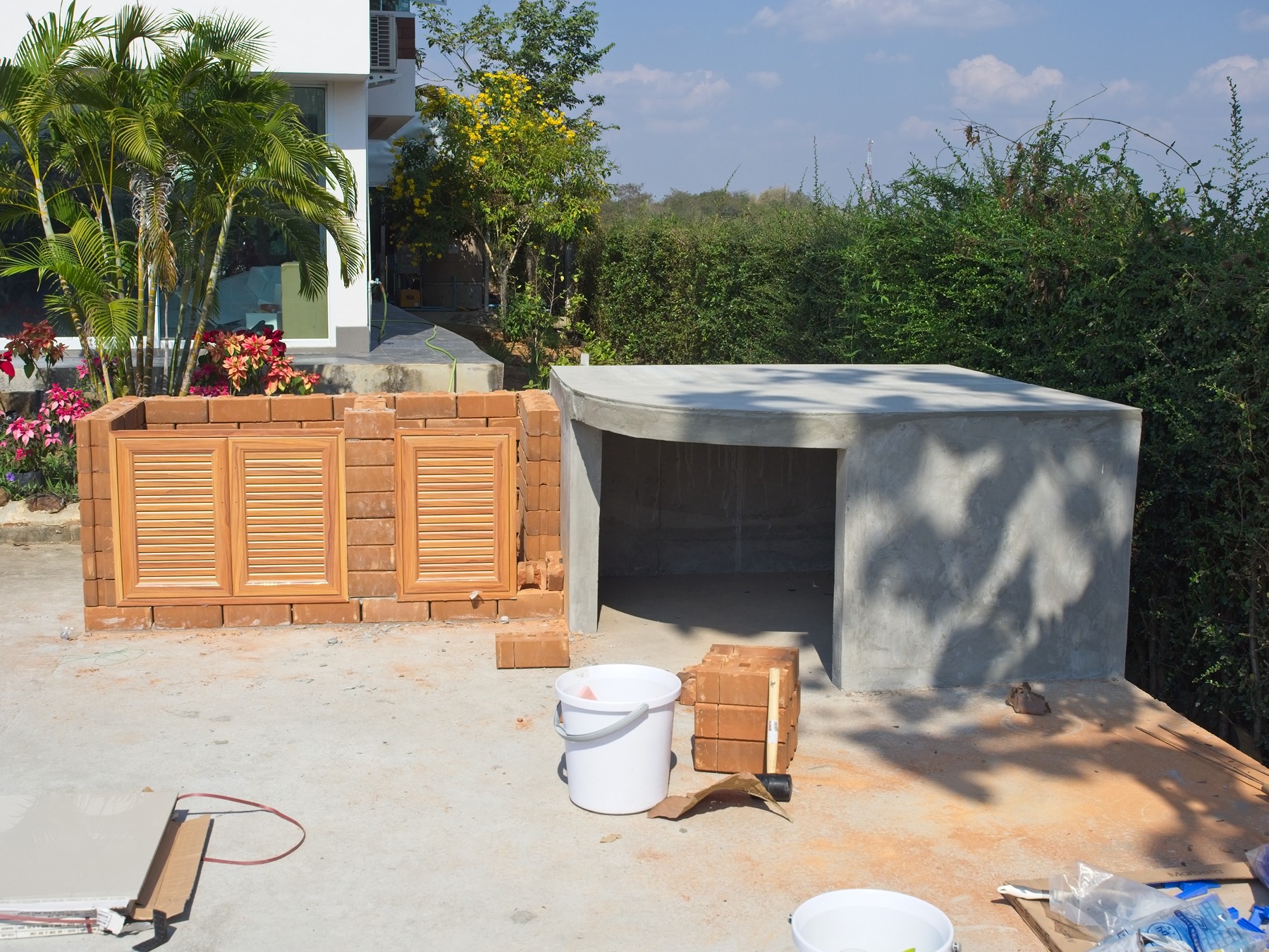 The cement truck was in the driveway, and they poured cement into wheelbarrows: