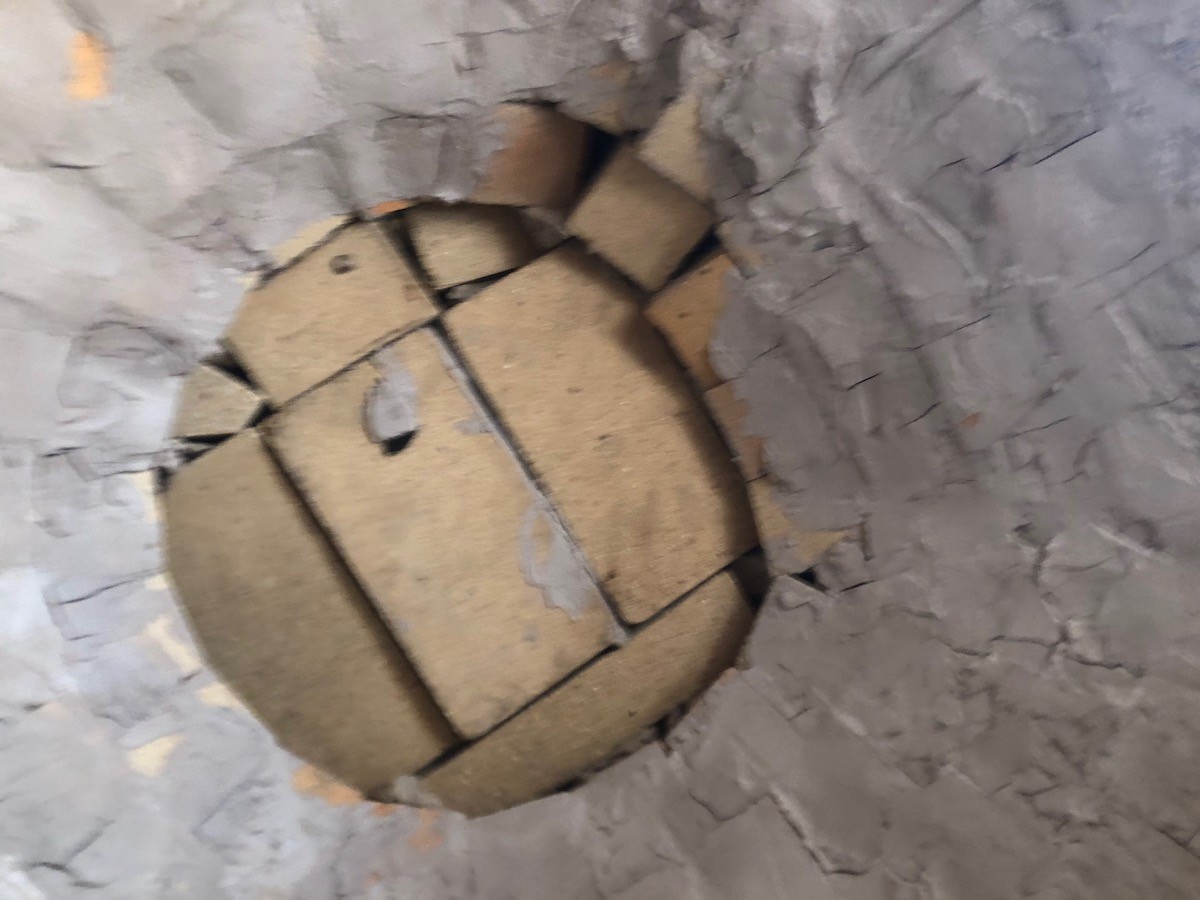 I think the last four courses are their work. It's like they just reached a certain point and gave up. The last couple of courses they just stoped used the IT. You can kind of see it starts to curve up, not down. I had the floor covered with plastic. I carefully set aside the center floor brick. They used the center brick for something else. Fortunately, there was at least one brick in reasonably good shape and complete we could use. Unfortunately, I think they swept debris into the whole, or it fell in, when they removed the IT. To me it looks a little proud, but that could just be an illusion because all the other bricks are discolored.